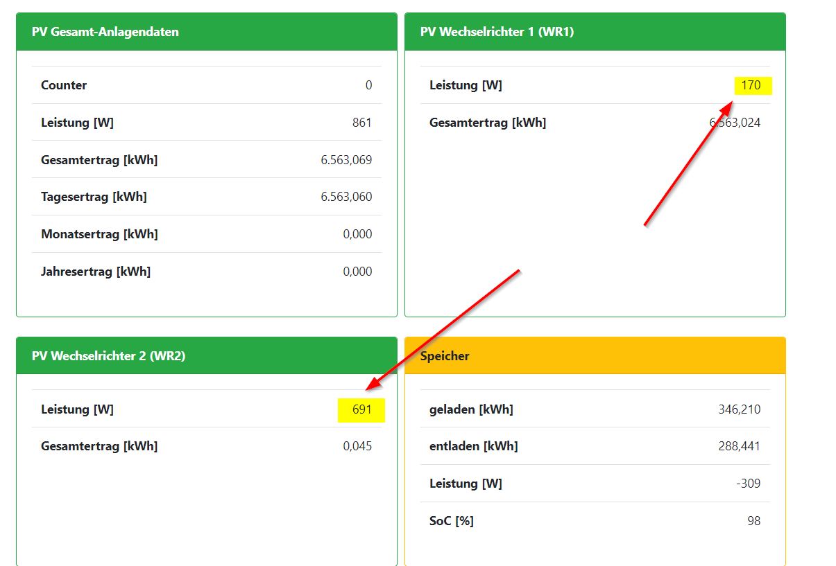 Der WR2 ist mir bei den Anpassungen der 1.9 durchgegangen. Ich vermute, dass die Meldung davon kommt. Bitte zum Testen mal PV2 nicht konfigurieren. Dann sollten die Meldungen verschwinden. Die Einstellungen reiche ich noch nach, wenn der nächste Absatz geklärt ist.