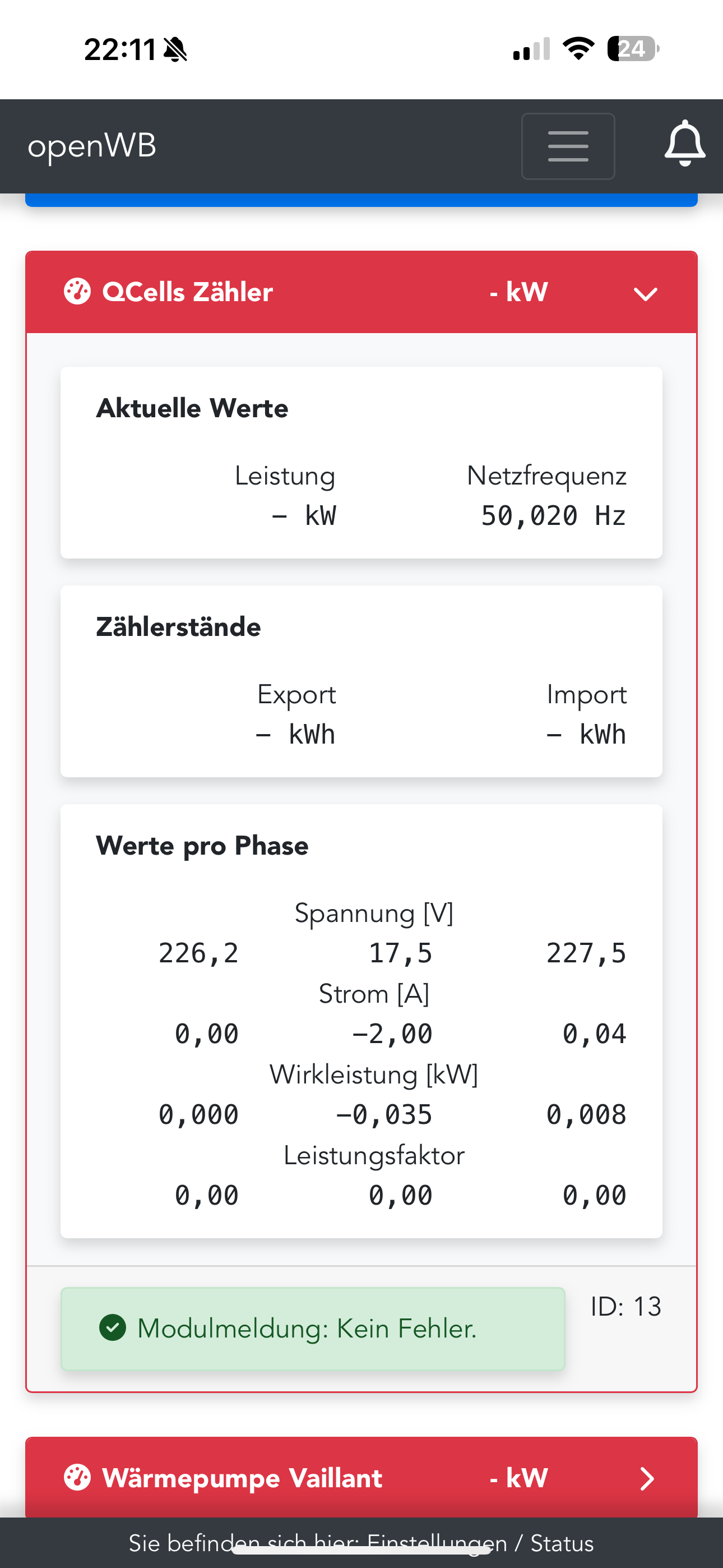 2025-05-05 23:00:01,883 - {modules.devices.sma.sma_sunny_boy.inverter:95} - {DEBUG:device1} - WR 192.168.2.28: InverterState(currents=[0.0, 0.0, 0.0], power=0, exported=17361397, imported=0.0, dc_power=4294967296)