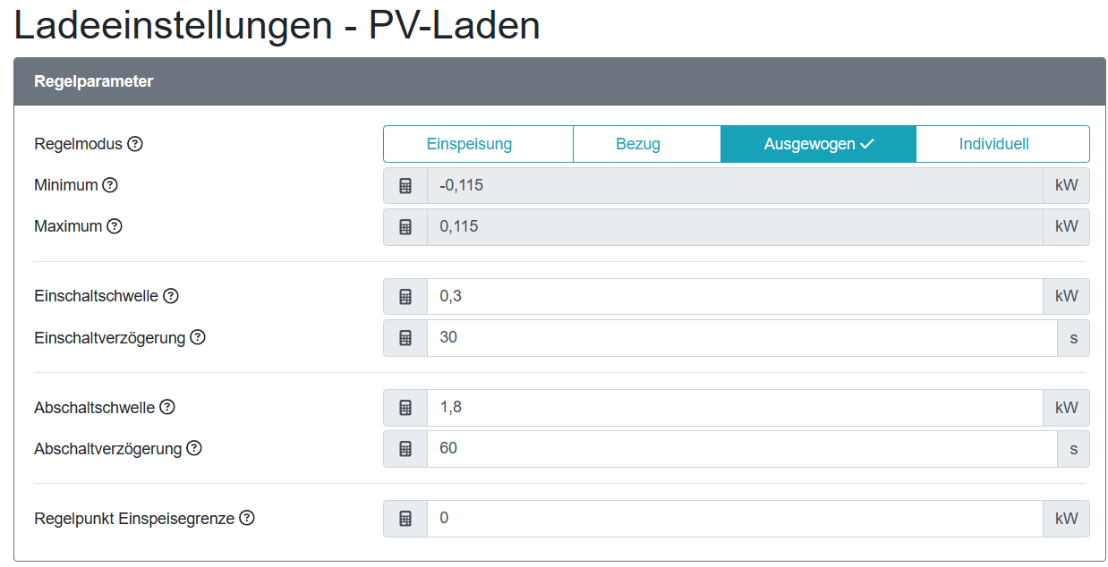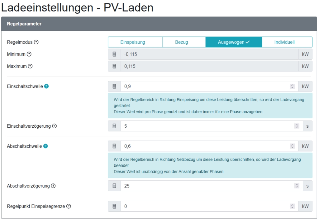 Zunächst aber nochmal zum Verständnis von Regelbereich und Ein/Aus-schaltschwelle. Im Hilfstext steht: „Wird der Regelbereich in Richtung Einspeisung um diese Leistung überschritten, so wird der Ladevorgang gestartet.“ Ich dachte der Regelbereich ist durch die Auswahl z.B. -0,115/+0,115 festgelegt und dann kommt die Einschaltschwelle „…um diese Leistung überschritten…“ noch dazu.