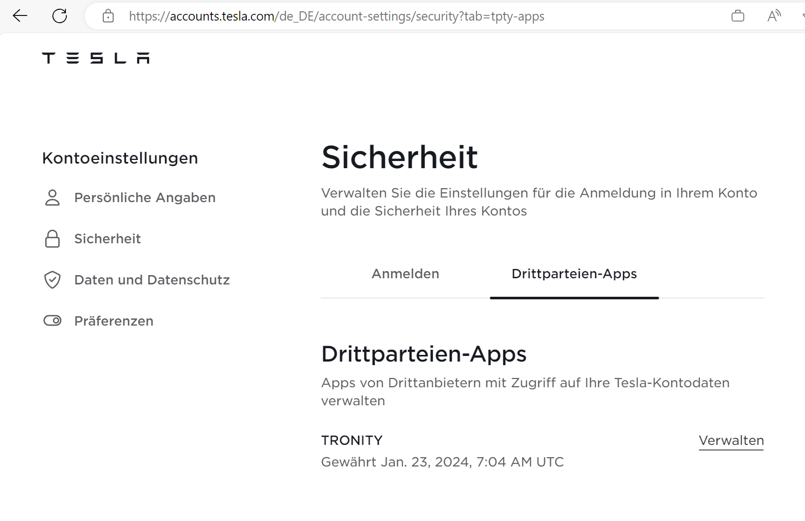 Das gibts im Tesla Account, dort tauchen all diejenigen Apps auf welche über die neue FleetAPI zugreifen und über oAuth2 authorisiert wurden.LutzB hat geschrieben: Mi Feb 07, 2024 12:20 pm In "Tesla Dritt Apps" wird nichts auftauchen. Was und wo gibt es das überhaupt?