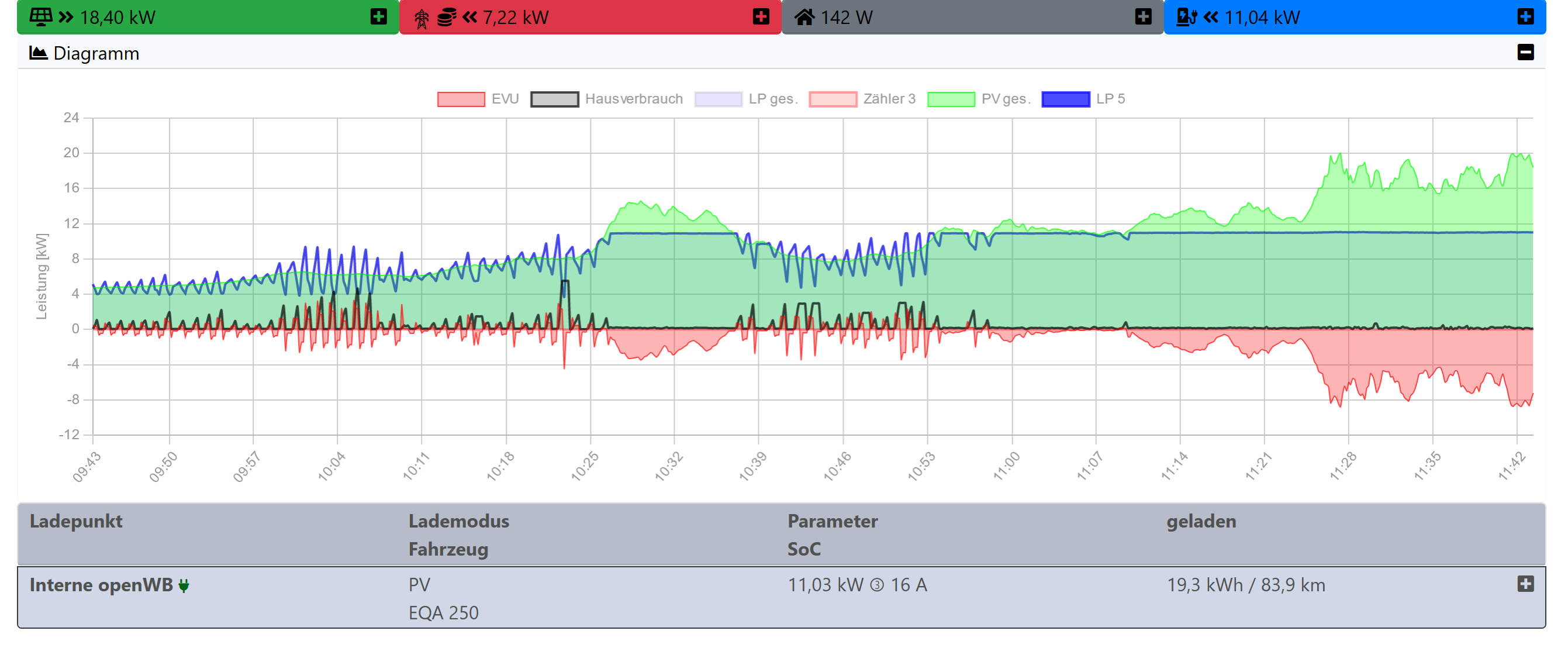 Wenn nun aber mehr PV Leistung zur Verfügung steht, so wird ja dann auf 3 phasiges laden umgestellt. Und hier schafft es die Regelung nicht mal annährend der steigenden Produktion zu folgen. Entweder voll übersteuert oder wieder voll untersteuert. Selbst wenn Produktion und Ladung sich im Grenzbereich von den Einstellungen "Ausgewogen" befinden, so wird noch nachgeregelt.