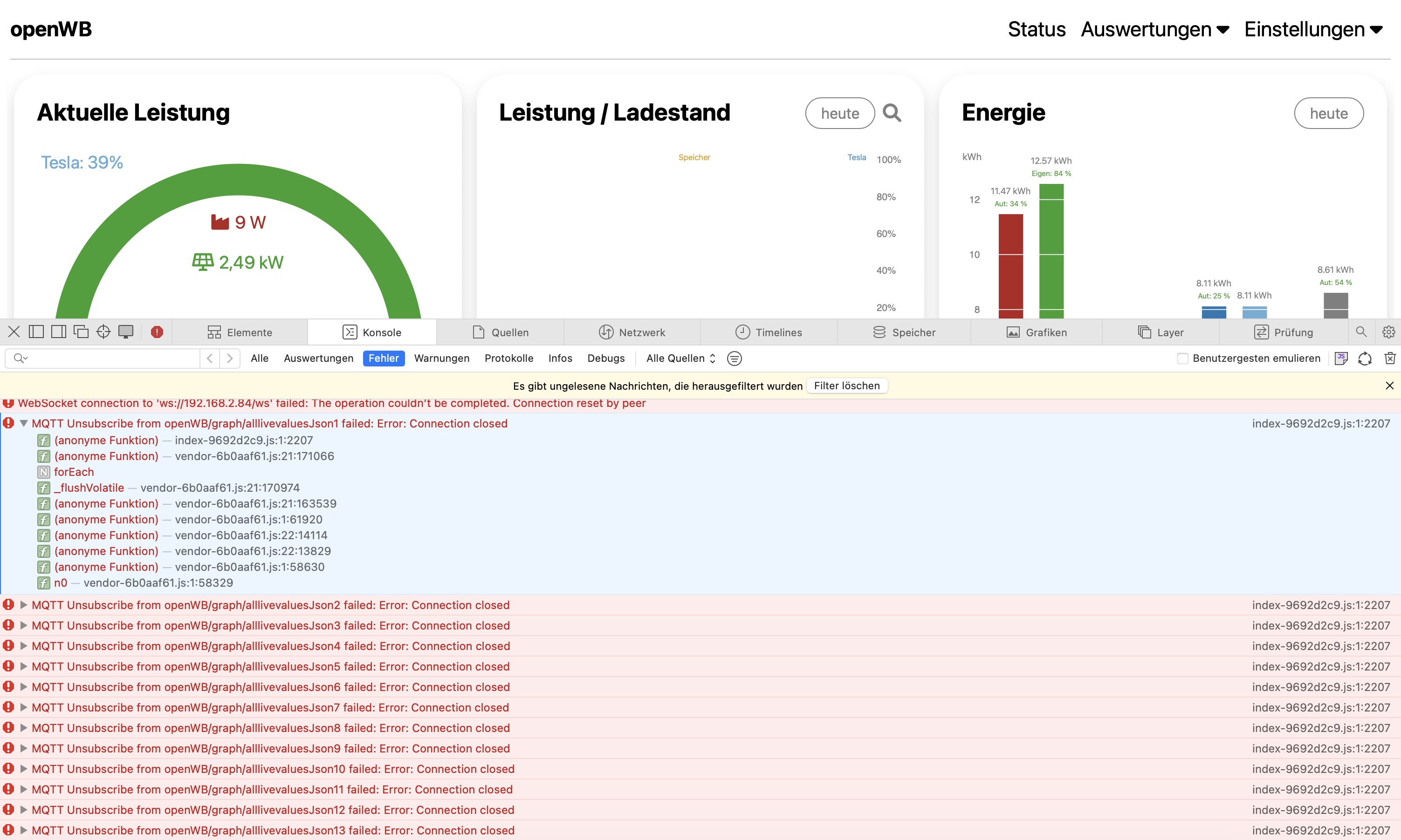 Meine Vermutung für die Fehler beim Aktualisieren des mittleren Graphen ist ein Abbruch der Websocket-Verbindung. Die MQTT-Pakete werden über eine Websocket-Verbindung zwischen dem UI und der openWB geschickt. Wenn das UI eine Zeitlang nicht erreichbar ist (weil es nicht sichtbar ist und temporär deaktiviert wurde), bricht der Server die WebSocket-Verbindung ab. Wenn das UI dann wieder aktiv ist und versucht, MQTT-Nachrichten zu senden oder empfangen, fehlt ihm die Verbindung. Ich habe aber noch nicht herausgefunden, wie man das verhindern kann.