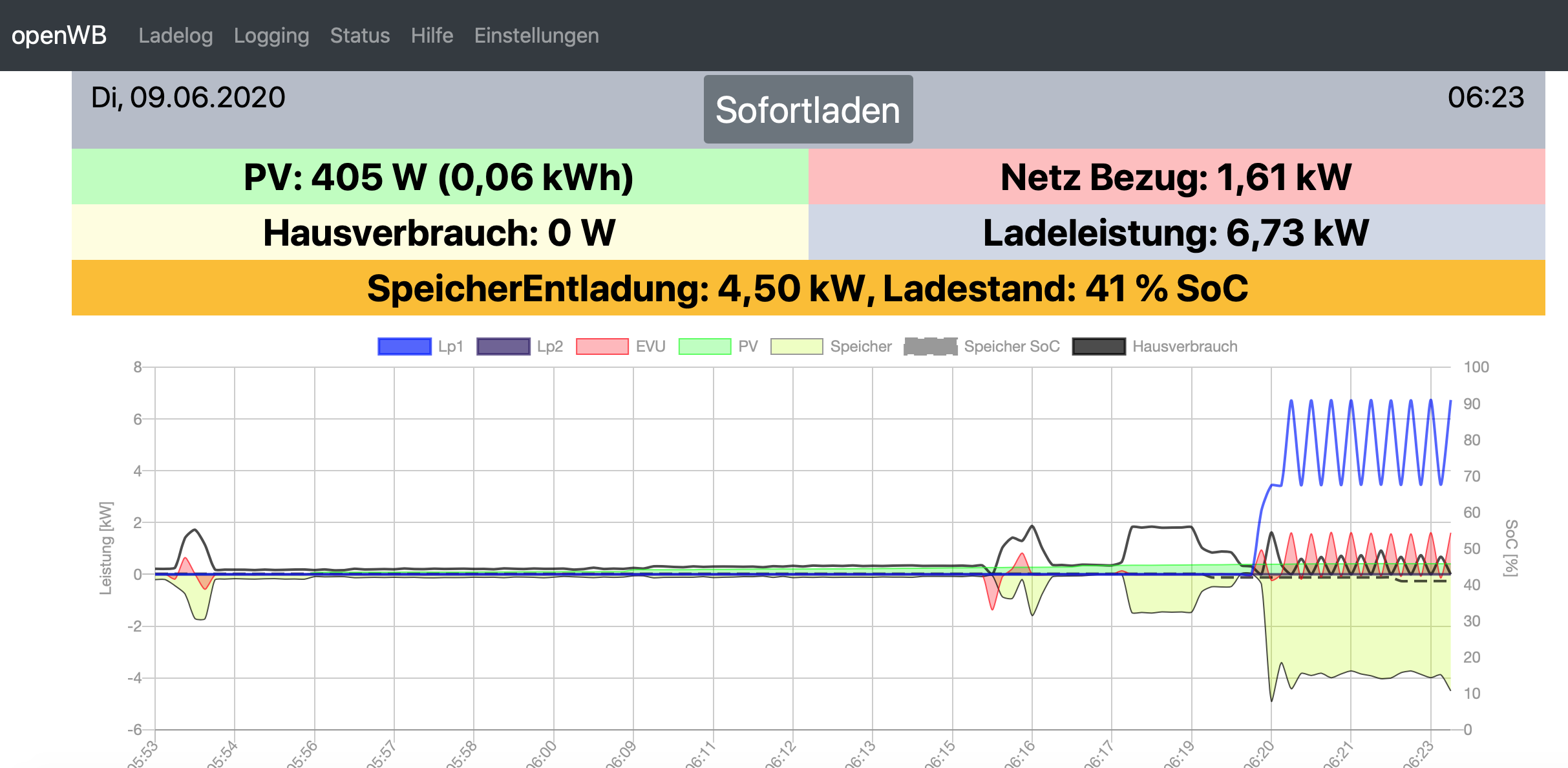 So 7. Jun 13:30:37 CEST 2020 alle Ladepunkte, Lademodus NurPV. Ladung gestartet mit 6 Ampere