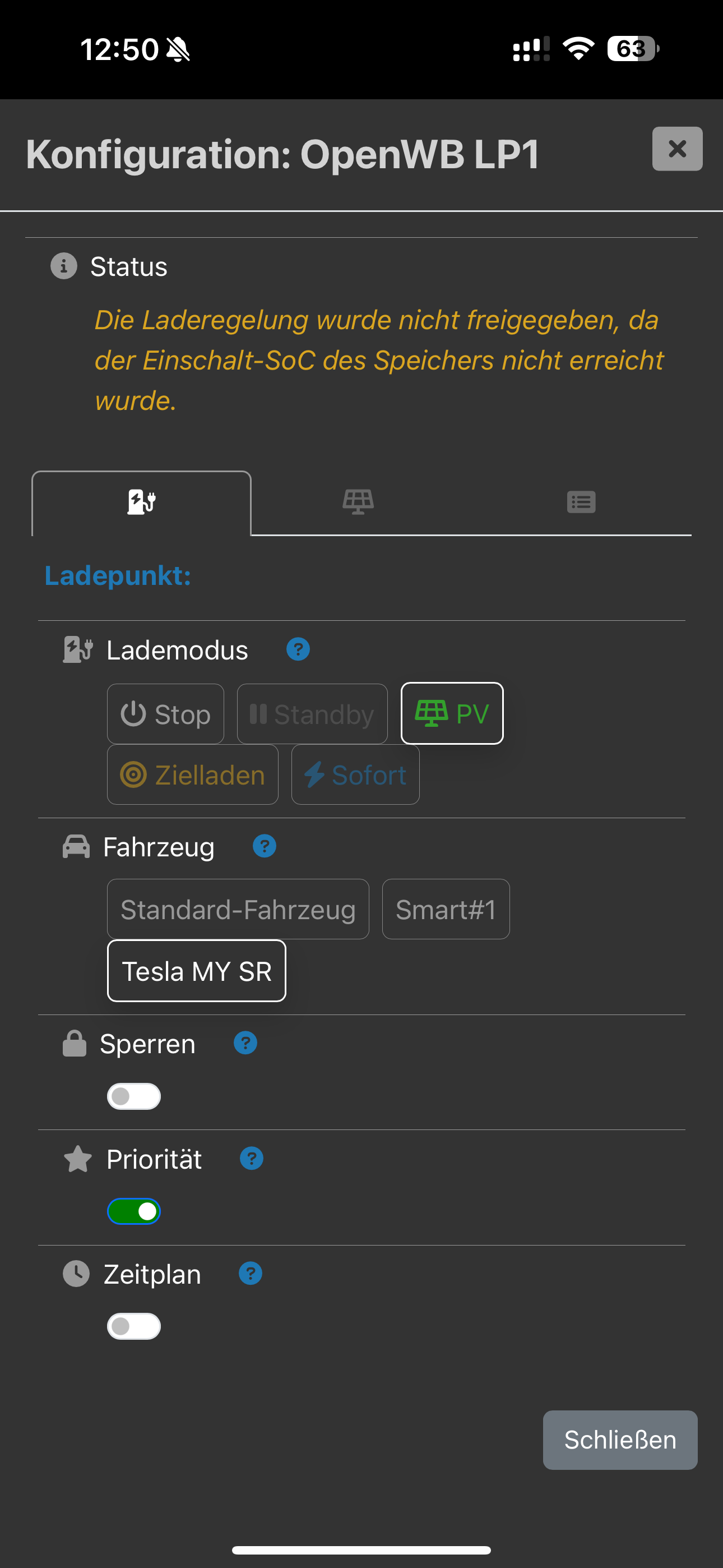 Das Fahrzeug ist entsprechend der Tipps der Opel Kollegen hier in der config hinterlegt. Zielladen mit allen verfügbaren Phasen ist auf 07:10 für 80% eingestellt.
