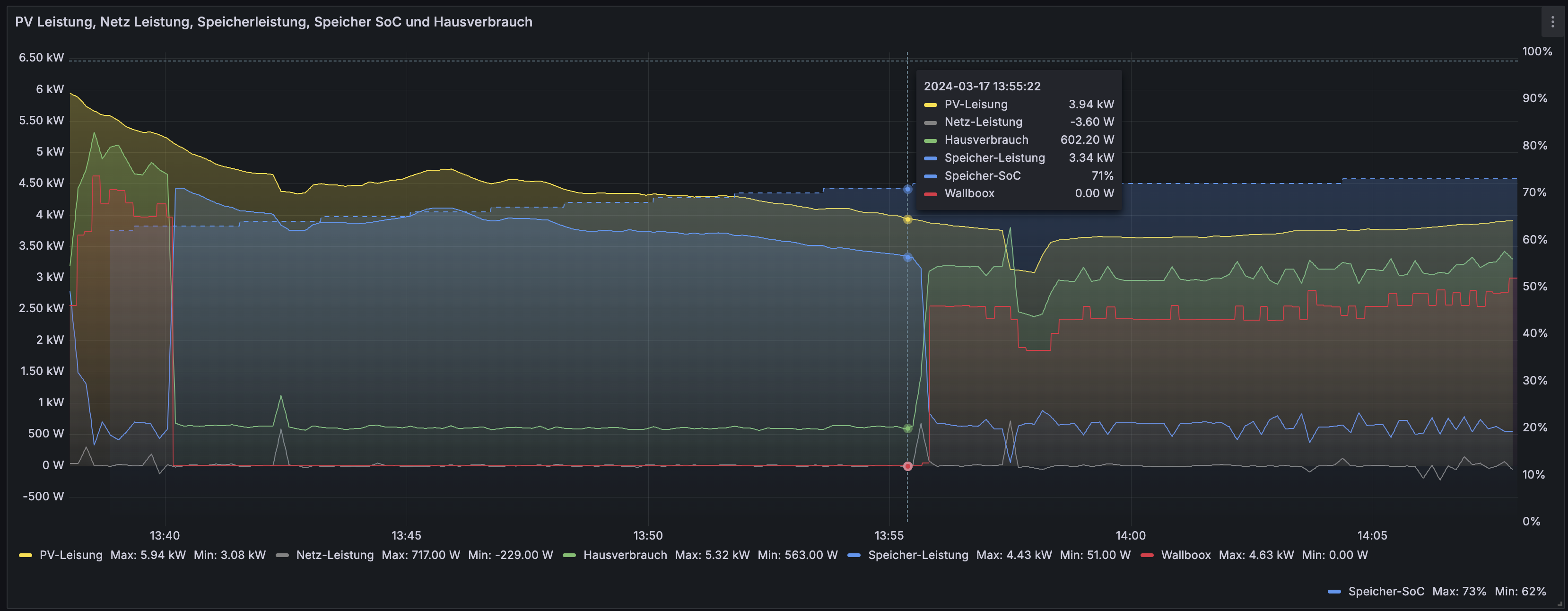 Meinem Verständnis nach dürfte das Laden erst Starten, wenn die Einspeisung > 1,4 kW für > 30 Sekunden überschritten ist. Allerdings startet das bei mir obwohl keine Einspeisung stattfindet.