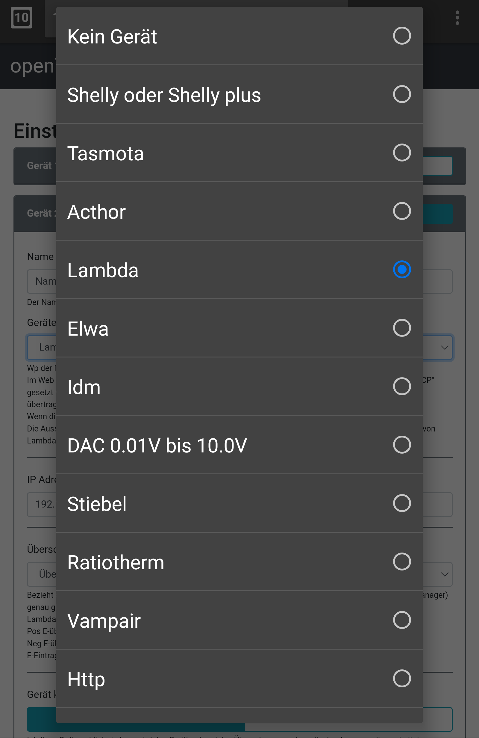 Man wechselt einfach innerhalb der openWB-sw2 unter "Einstellungen -> Konfiguration -> Smarthome" auf den SH-Bereich, sucht das Gerät Lambda aus und gibt dort die gewünschten Parameter der Lambda ein. Natürlich muss die Lambda mit openWB sprechen könne, weshalb bei ihr gewisse Voreinstellungen zu treffen sind (Port, Fernsteuermodus etc.). Das haben schon andere durchgeführt und in passenden threads zu lambda hier im Forum dokumentiert.