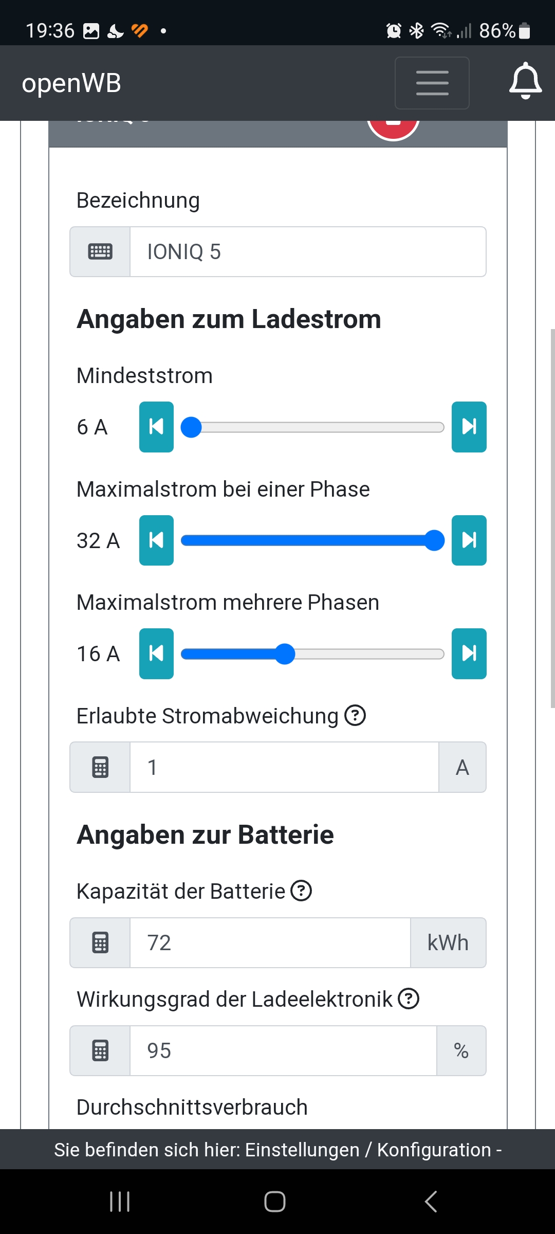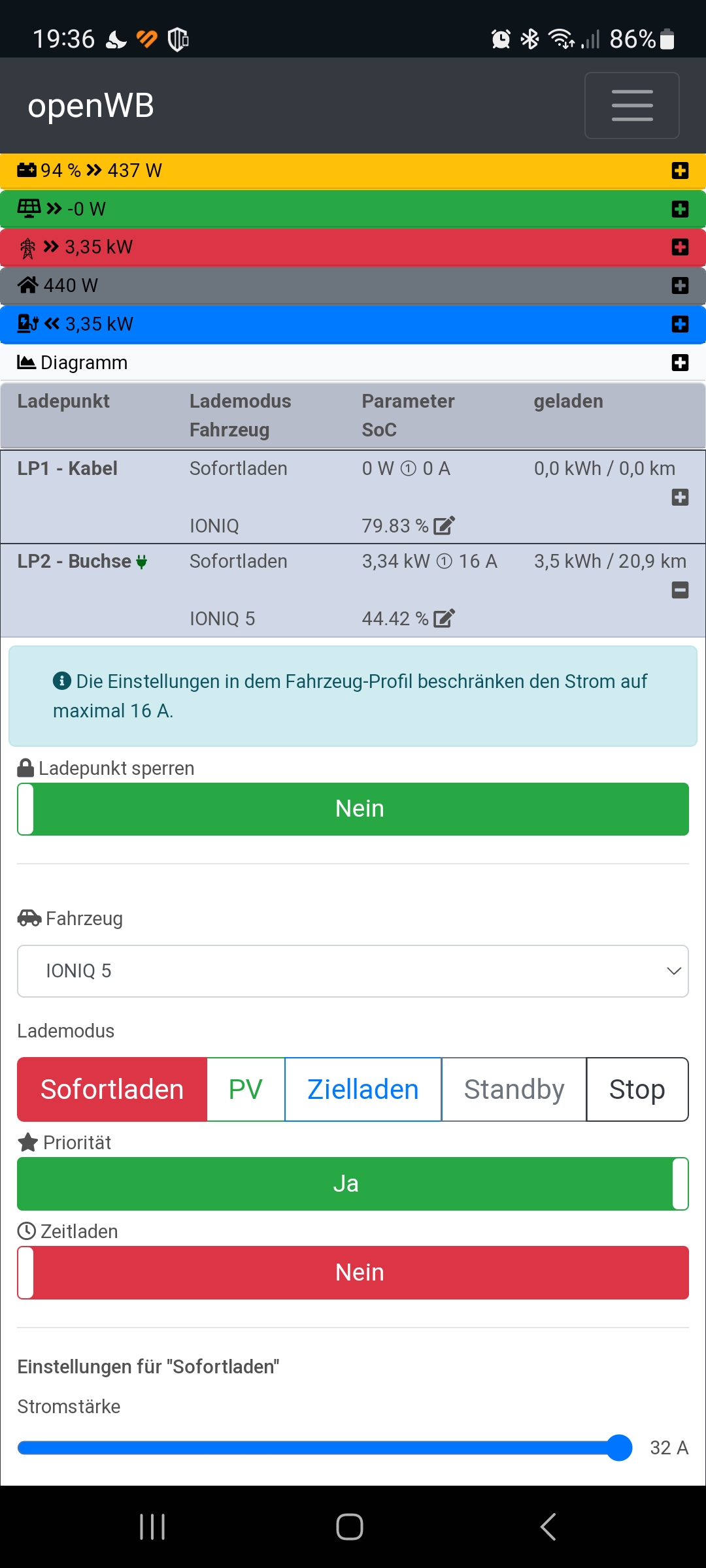 Trotzdem wird auf die im Fahrzeug-Profil eingestellten 16A für mehrphasiges Laden begrenzt, obwohl für 1p-Laden 32A eingestellt sind.