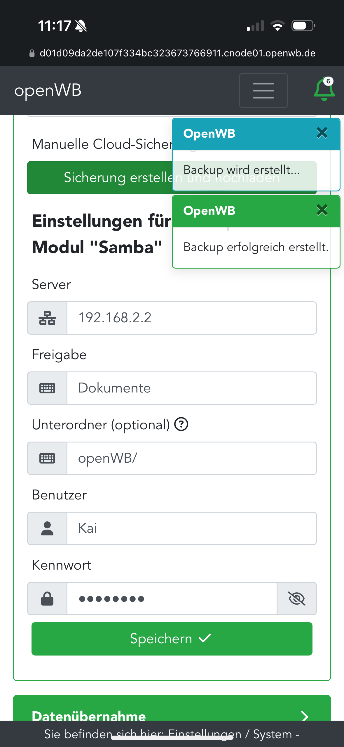 Hallo openWB Team - können wir dem Problem der nicht durchgeführten Samba Sicherung bitte auf den Grund gehen?kai9555 hat geschrieben: Mi Feb 14, 2024 3:21 pm Ich wollte ebenso gerade das Cloud Backup über Samba einrichten. Kann es sein das es mit dem aktuellen Master 2024-02-12 10:49:39 +0100 [47a9006d1] nicht funktioniert?