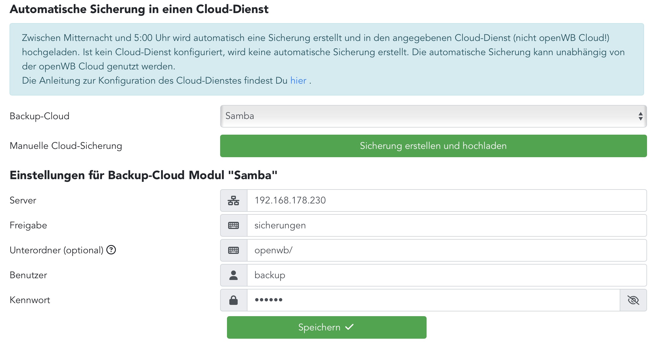 Hintergrund:Zwischen Mitternacht und 5:00 Uhr wird automatisch eine Sicherung erstellt und in den angegebenen Cloud-Dienst (nicht openWB Cloud!) hochgeladen.