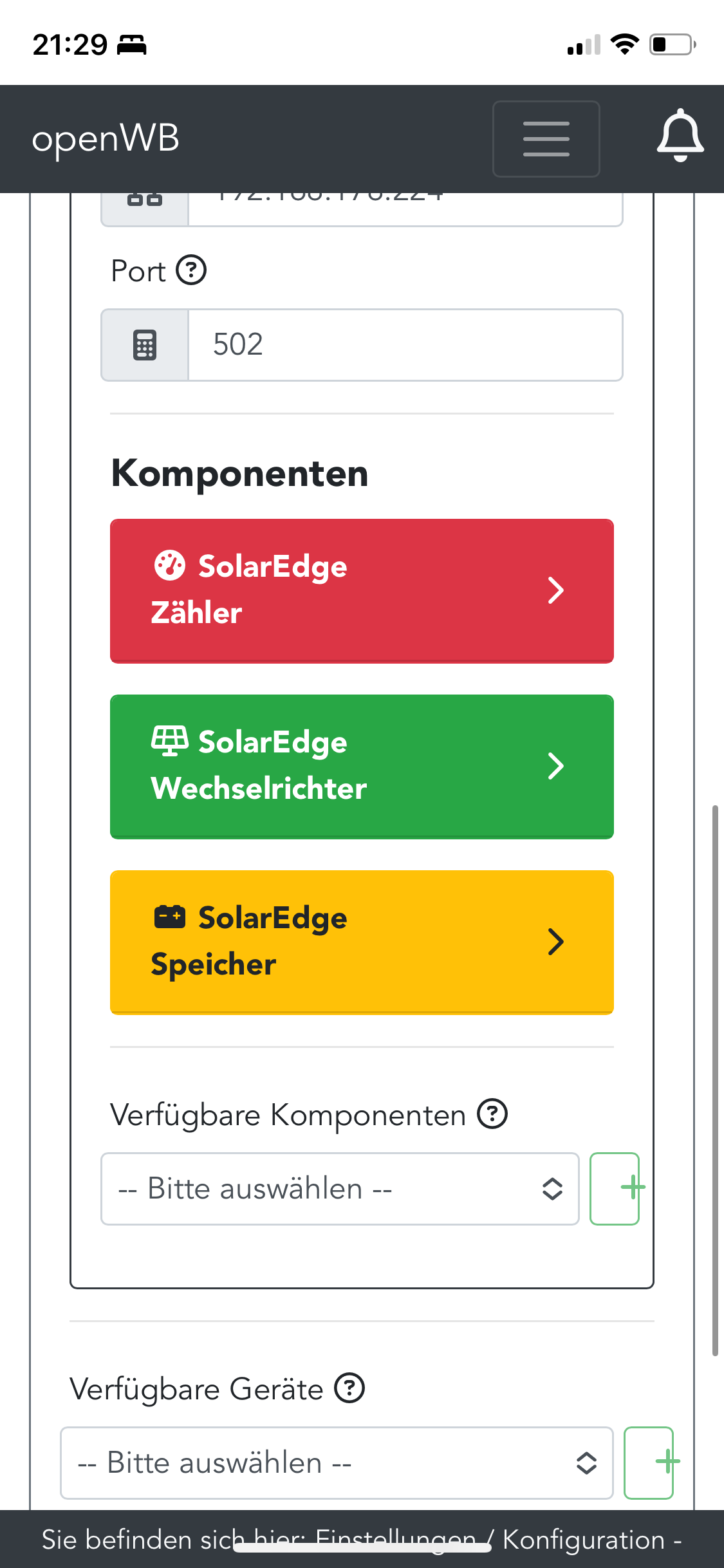 Ich gehe auf "Konfiguration" --> "Geräte und Komponenten" --> "Verfügbare Geräte" --> "Solar Edge" --> "+"