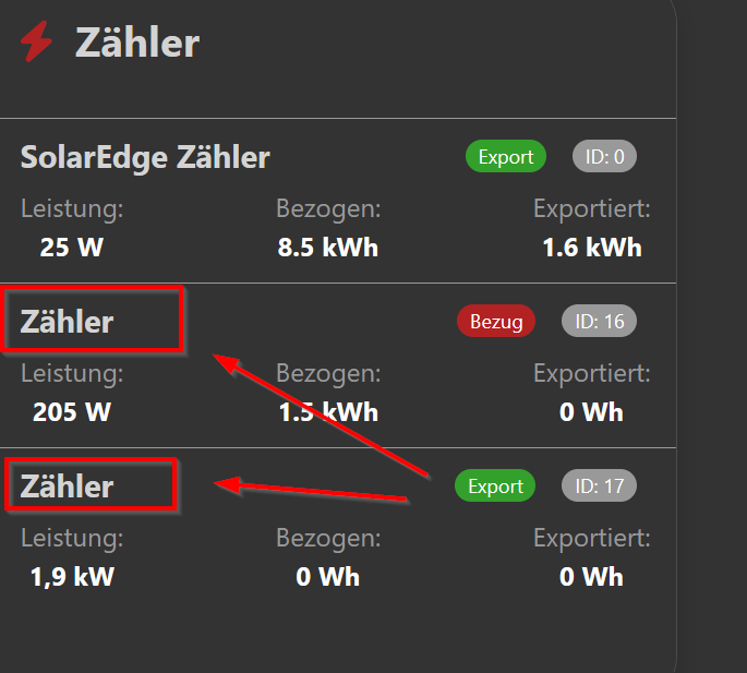 kannst Du vielleicht die Bezeichnung der Zähler noch anpassen? Schön wäre es, wenn die Namen aus der Konfiguration übernommen würden.