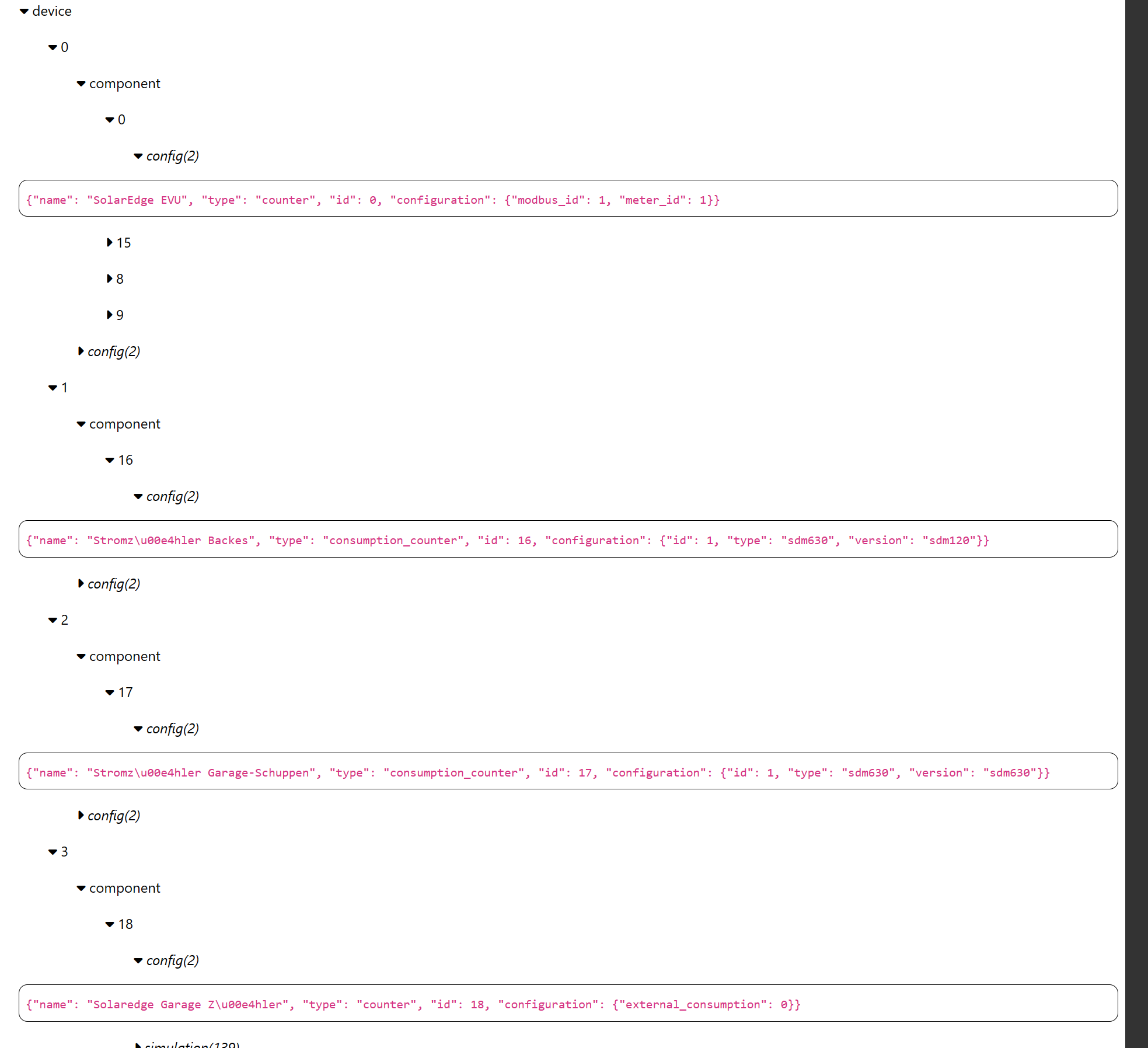 fussi24 hat geschrieben: So Apr 21, 2024 12:28 pmelectron hat geschrieben: So Apr 21, 2024 12:11 pm Könntest Du noch eine Ebene tiefer schauen (unter "component/config")? Die Namen werden von dort gelesen, allerdinngs nur wenn der Parameter "type" den Wert "counter" hat. Daher würde ich gerne sehen, welchen "type" Deine verschiedenen Zähler haben. Ich vermute, dass die, bei denen der Name nicht angezeigt wird, etwas anderes im "type" stehen haben.