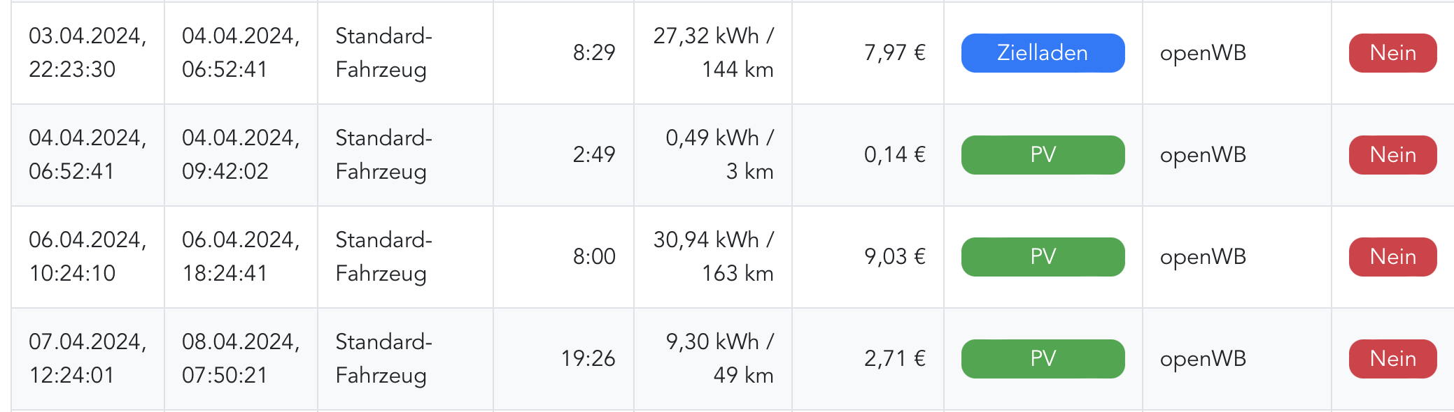 ich habe mich das erste Mal mit meinem Ladelog auseinandergesetzt, weil ich die tatsächlichen Stromkosten (=Netzbezug) eines Ladevorgangs herausrechnen möchte. Scheinbar klappt das leider nicht, die openWB setzt für sämtliche Ladungen den gleichen kWh-Preis an, ganz egal ob ich (nahezu) reinen PV Bezug habe oder ob ich im Zielladen-Modus bin: