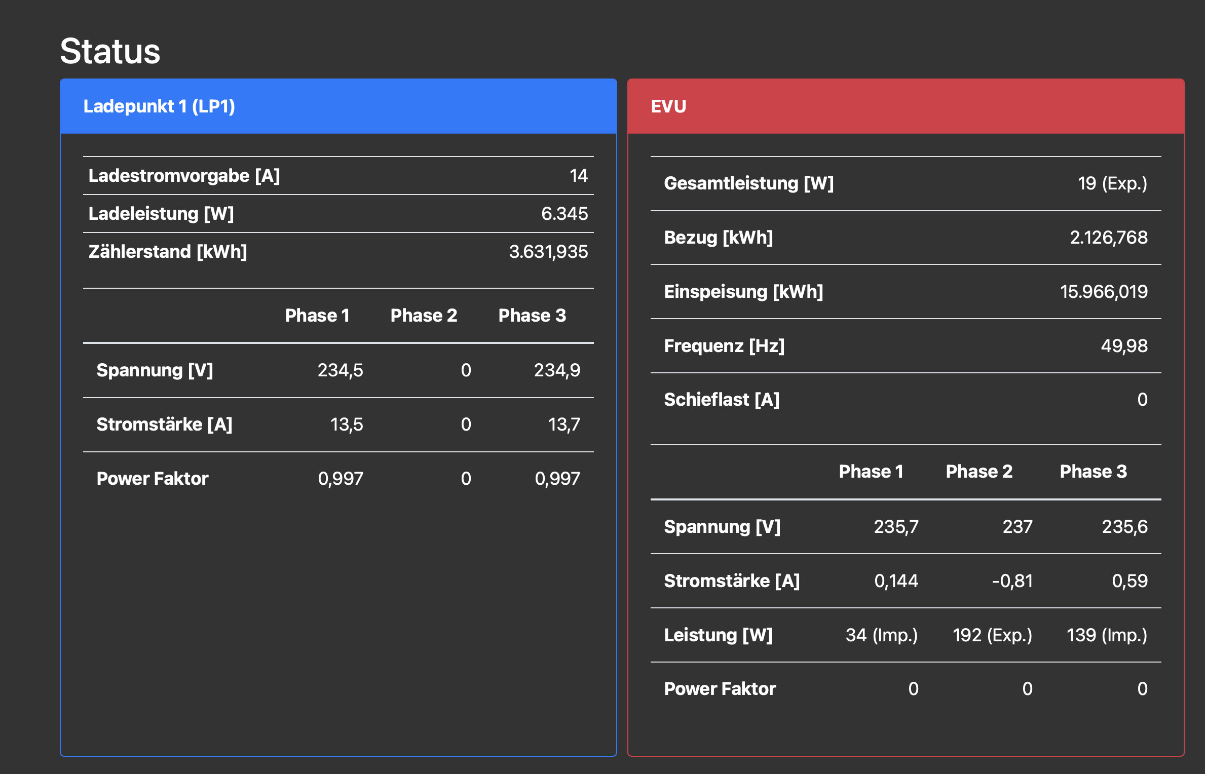 Gero hat geschrieben: Do Mai 23, 2024 7:01 am Oder der Leistungsmesser in der openWB nur auf zwei Phasen mißt, weil der auf der dritten Phase kaputt ist. Die Hardware kann nur 1 oder 3-phasig schalten. Was sagt denn die Status-Seite?