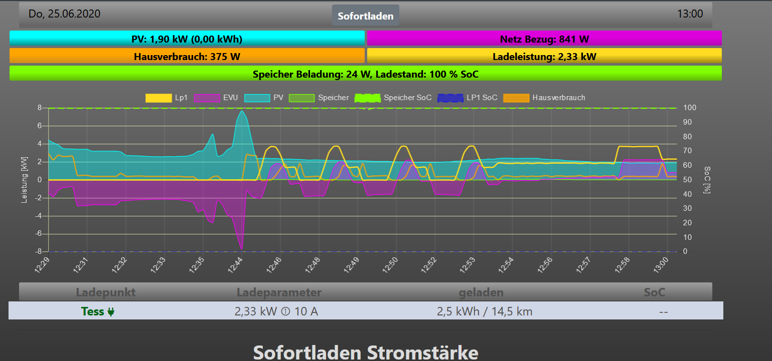Weitere Beobachtung, wenn ich den Ladenstrom per Sofortladen auf +-500 Watt an Einspeisung anpasse und dann auf PV wechsele, passiert nichts.