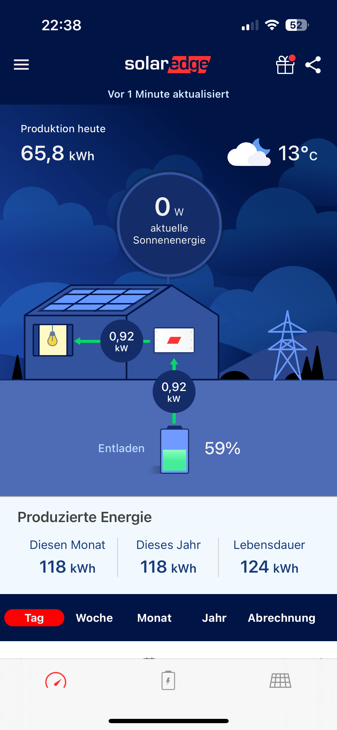 Die Einstellungen der SolarEdge-Komponenten scheinen noch nicht zu passen. Der Wechselrichter zeigt eine PV-Leistung an, obwohl es dunkel ist ... Die Leistung gleich fast exakt der Leistung, die zeitgleich dem Speicher entnommen wird.