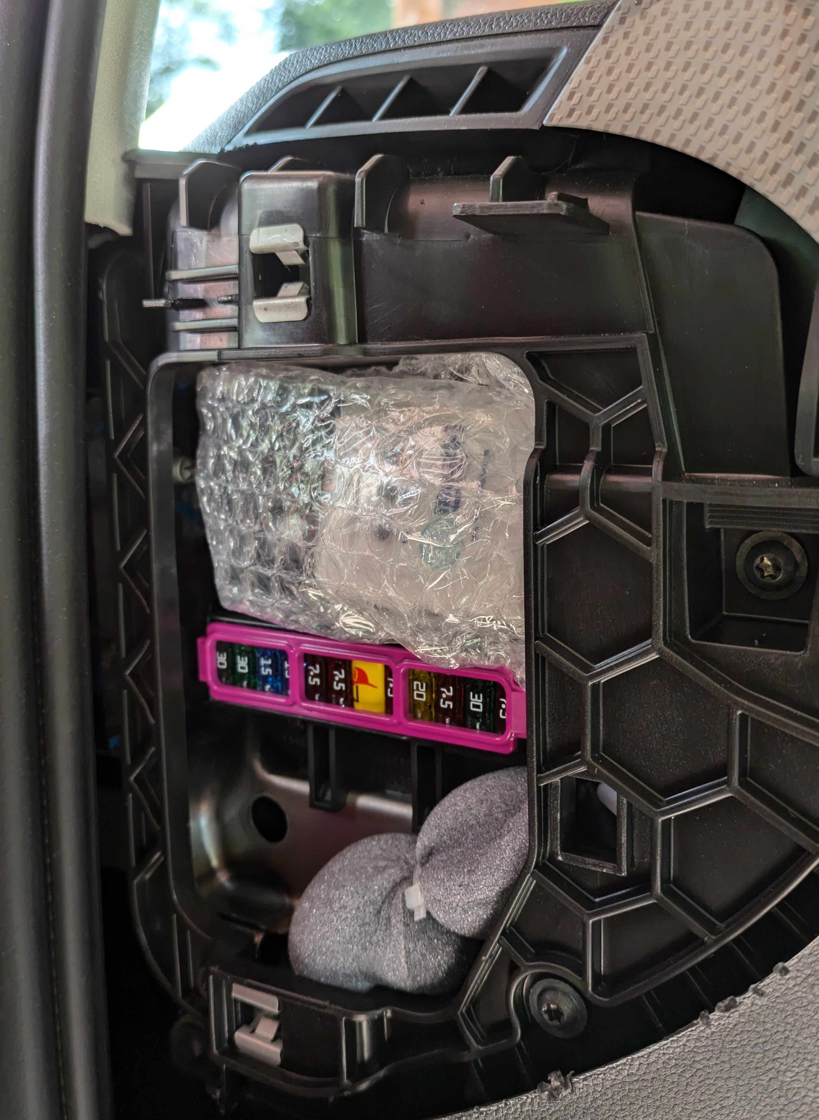 Ich habe mir eine OBD-Verlängerung mit abgewinkeltem flachem Stecker besorgt und hinter der Knieverkleidung in den Sicherungshalter hinter der Fahrertür gelegt. Dort liegt, mit Schaumfolie umwickelt, der WiCAN. Der Fußraum ist absolut unauffällig, und wenn ich zur Werkstatt oder HU muß, wird der Stecker unten abgezogen und etwas hinter die Verkleidung geschoben. Bemerkt keiner. Meiner ist 1m lang, 0,6m hätten gereicht: