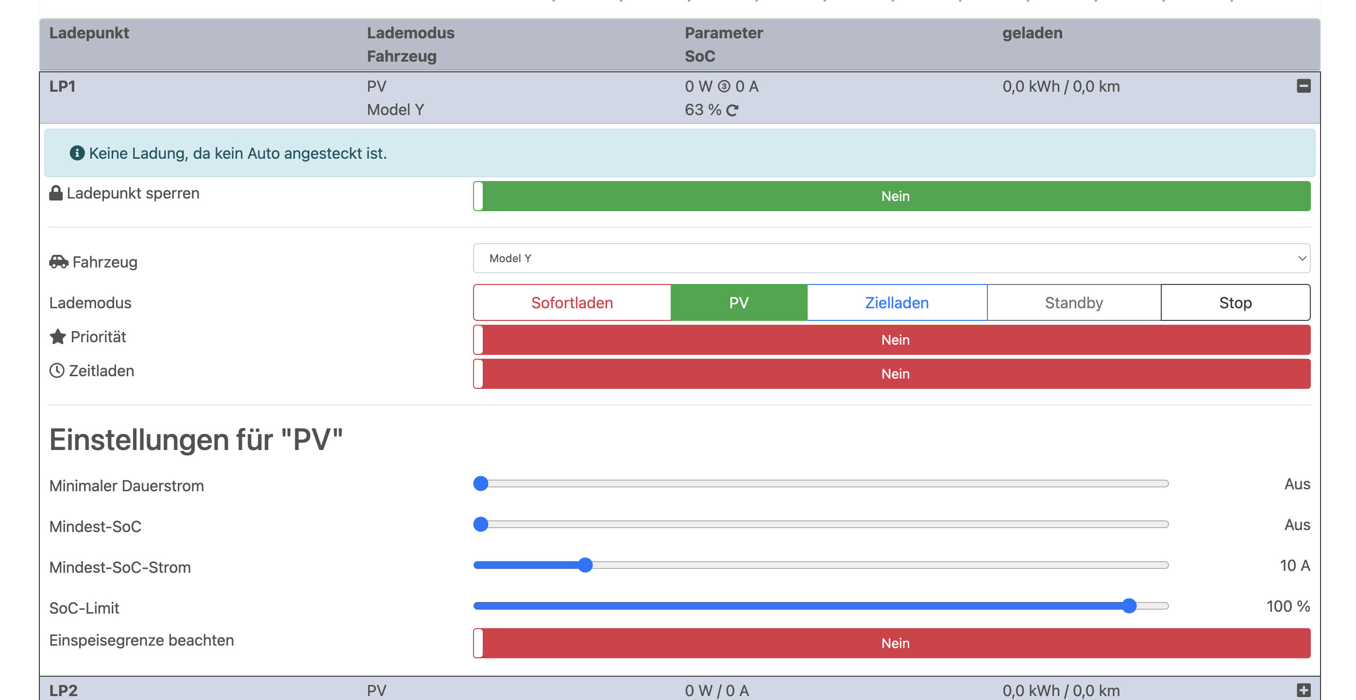 Ich schaffe es nicht, eine passende Konfiguration zu erstellen, bei der ausschließlich der Überschuss-PV-Strom genutzt und nur sehr wenig Netzstrom bezogen wird. Meiner Meinung nach bezieht der Ladepunkt zu viel Strom, da auch das Auto dann mit einer Soll-Stromstärke von über 20 Ampere lädt, was meiner Ansicht nach bei einem direkten PV-Bezug über den Wechselrichter inkorrekt ist. Soweit ich weiß, kann der Solar Edge Wechselrichter lediglich acht Ampere liefern.