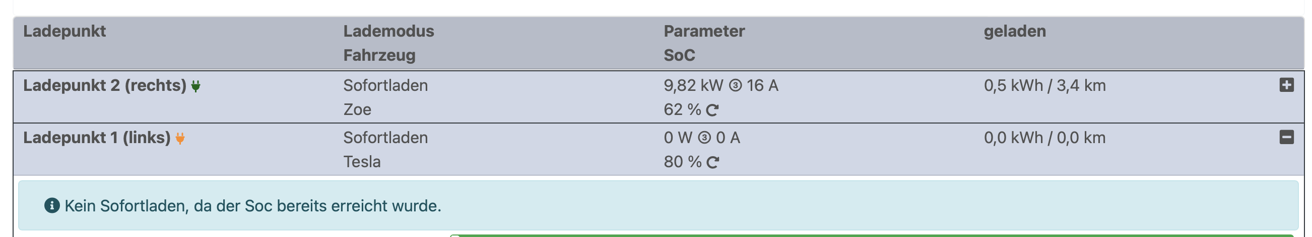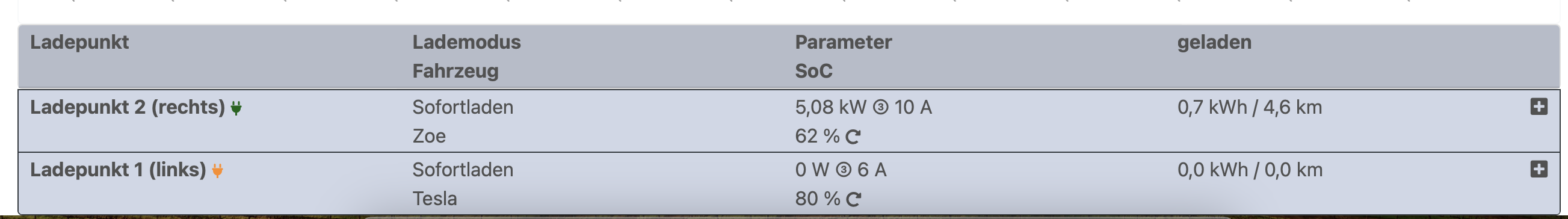 Was ich unlogisch finde, ist die Aufteilung 10A/6A, wenn das zweite Fahrzeug gar nicht lädt. Es bekommt eine Ladestromvorgabe, das ist mir klar, aber es zieht keine Leistung, so dass eigentlich 16A für das erste Fahrzeug übrig sind.