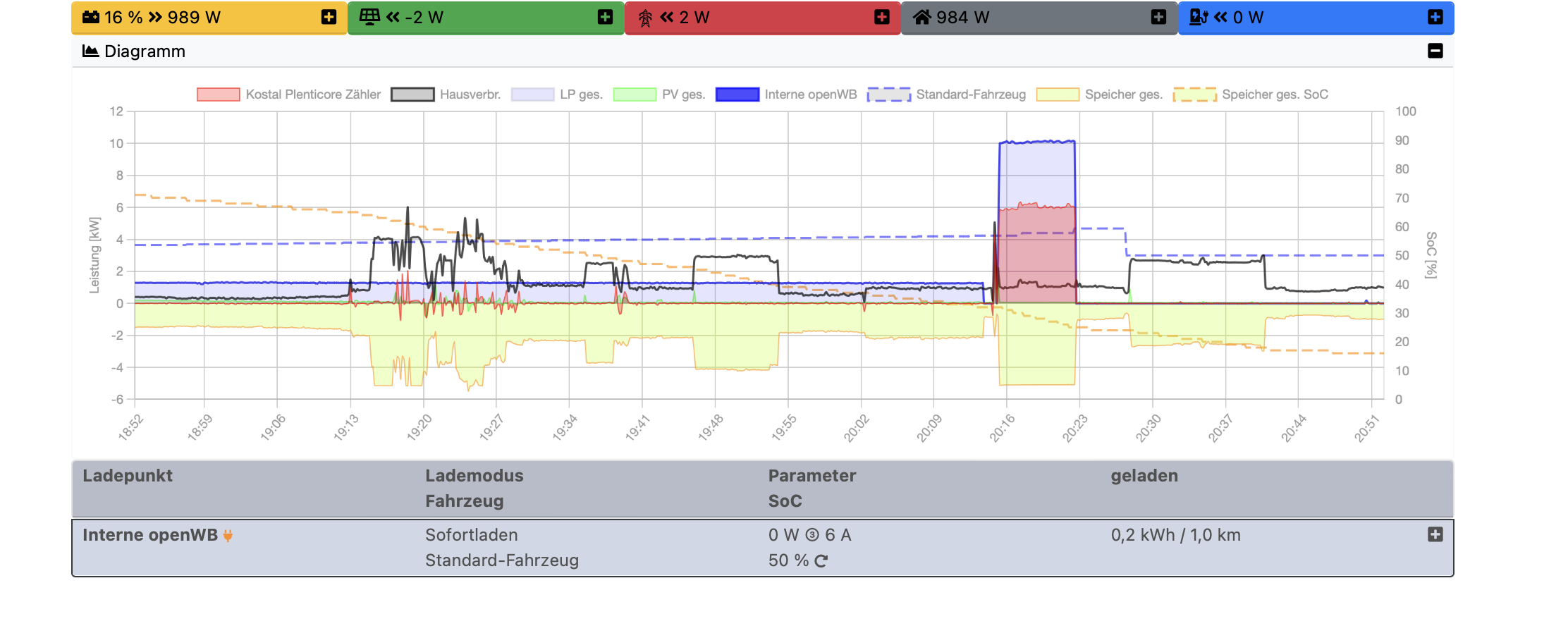 Am Abend hat er jetzt bei PV mit konstant 1,3kW geladen und den Hausspeicher leer gemacht. Hab dann umgestellt auf Sofort - Laden und das hat er dann kurz gemacht und dann einfach beendet. Anbei schicke ich einen Auszug vom Diagramm.