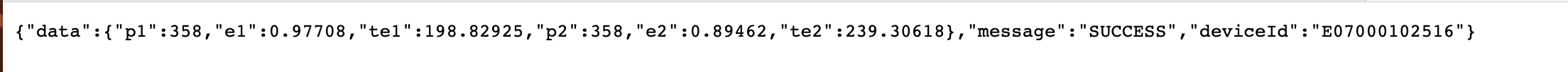{"data":{"p1":21,"e1":0.08444,"te1":2.61917,"p2":27,"e2":0.11900,"te2":3.49489},"message":"SUCCESS","deviceId":"E070XXXXXXX"}