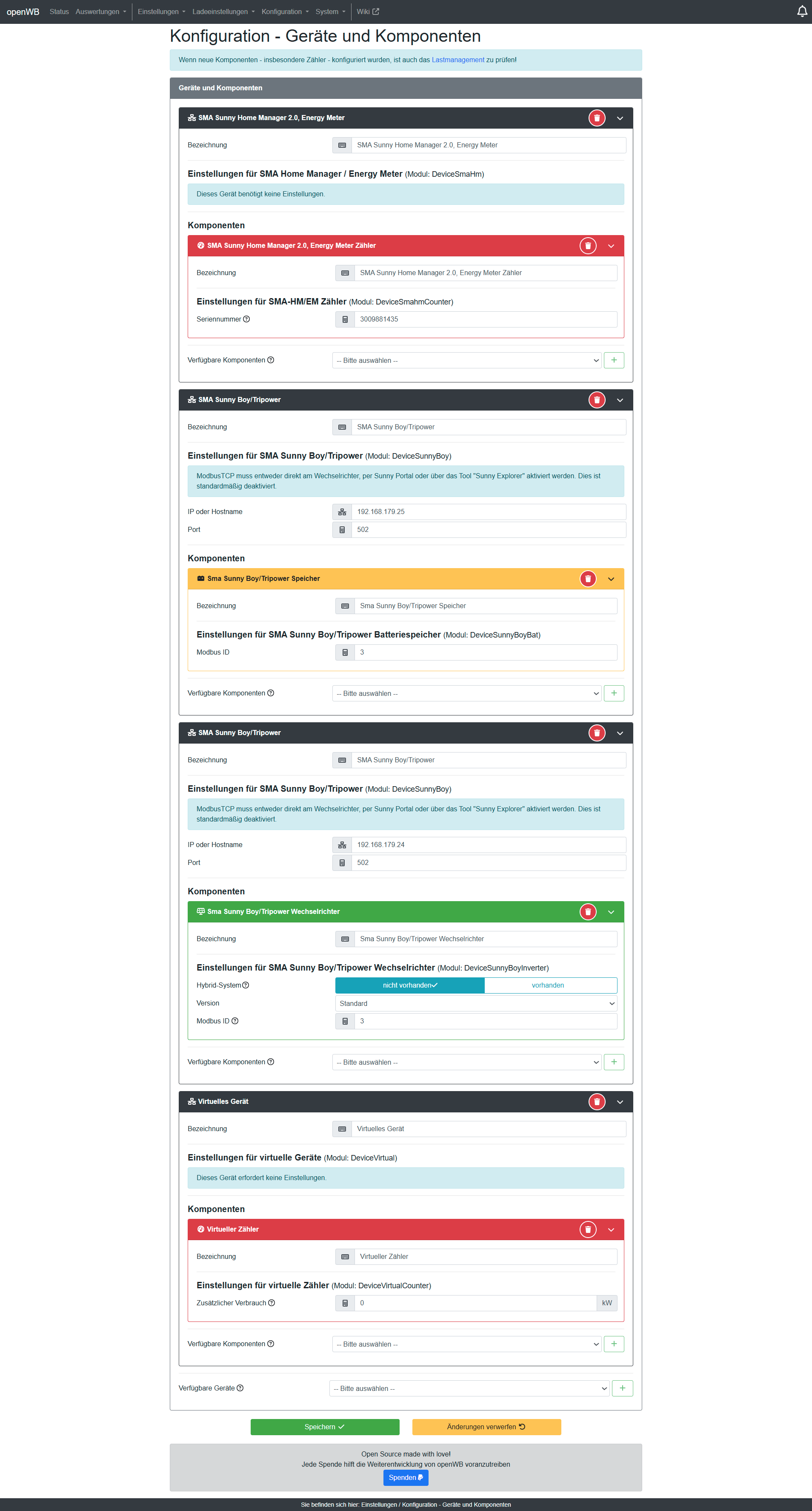 Keinen Zähler bei Hausverbrauch auswählen, sondern von openWB berechnen lassen.derTomGE hat geschrieben: Do Aug 29, 2024 1:33 pm Den virtuellen Zähler habe ich angelegt, da ich trotz Sunny Home Manager an erster Position die folgende Meldung erhalten habe: