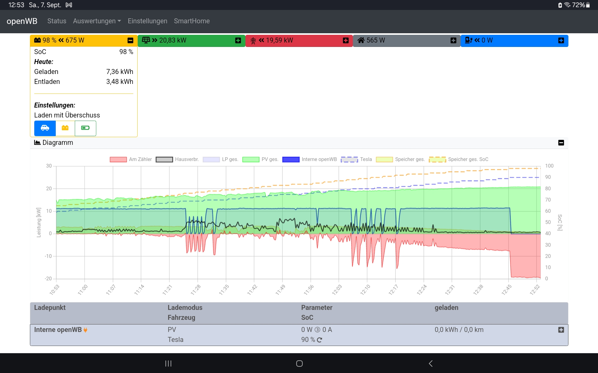 Beim Anstecken des zweiten Fahrzeugs (Tesla Model 3) (Modus PV-Laden, Prio Fahrzeug) startete kurz die Ladung, nur um sie danach wieder abzubrechen, neu zu starten und erneut abzubrechen und dann sauber mit 3p zu laden. Ich meine, die Phasenumschaltung war daran beteiligt und schaltete jeweils die Phasen von 1 auf 3 um - obwohl er schon mit 3p geladen hat.