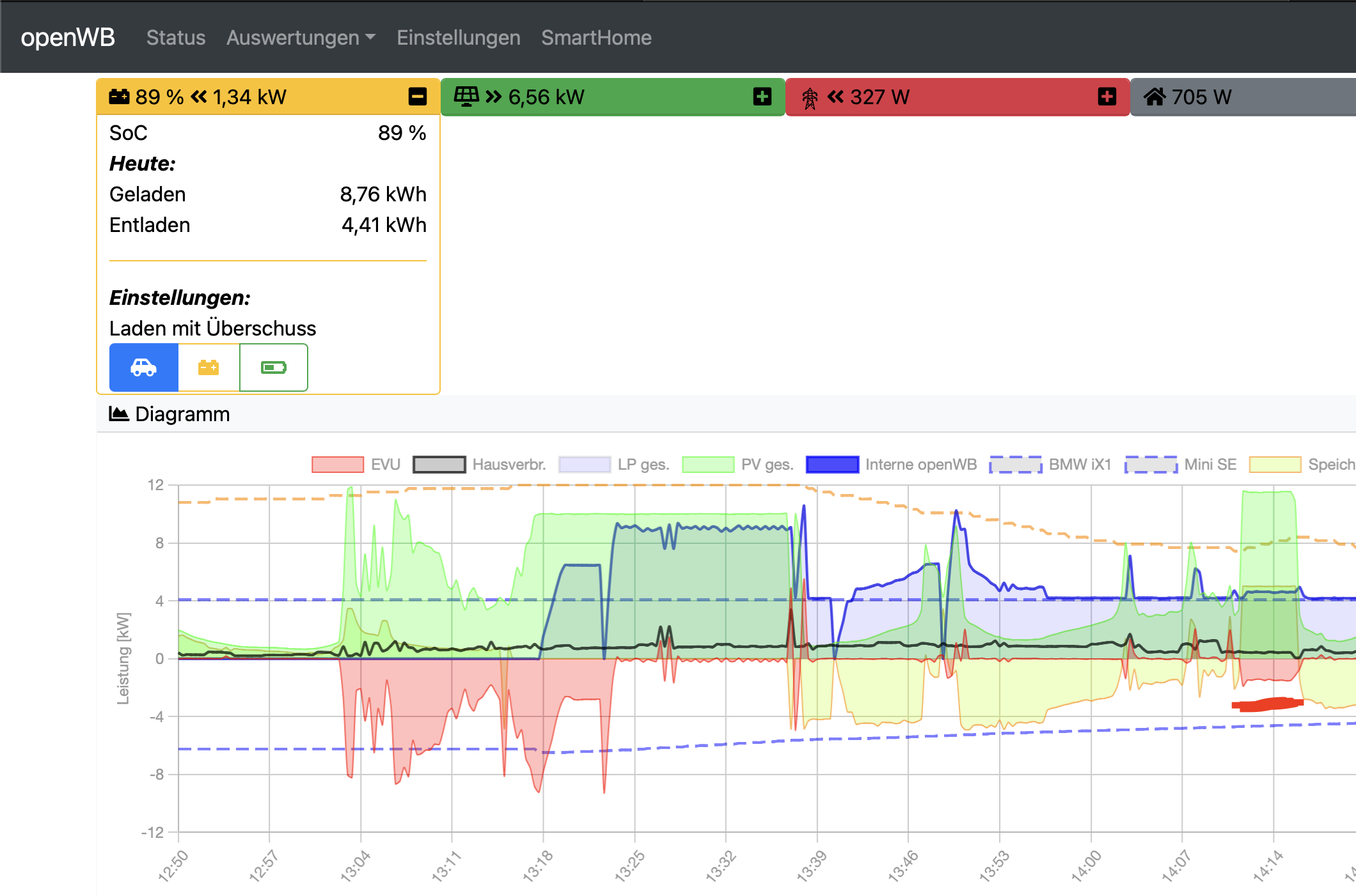 PV-Überschußladen, Speichervorrang ausgewählt, Es wird das Fahrzeug mit entsprechenden Meldungen mit 6 A weitergeladen:
