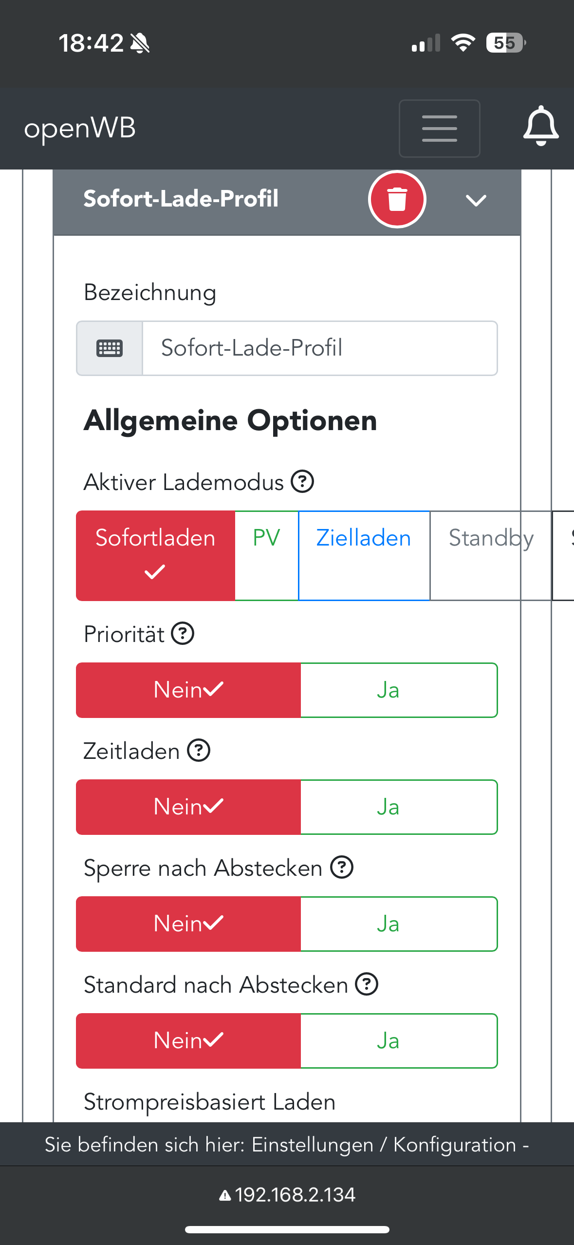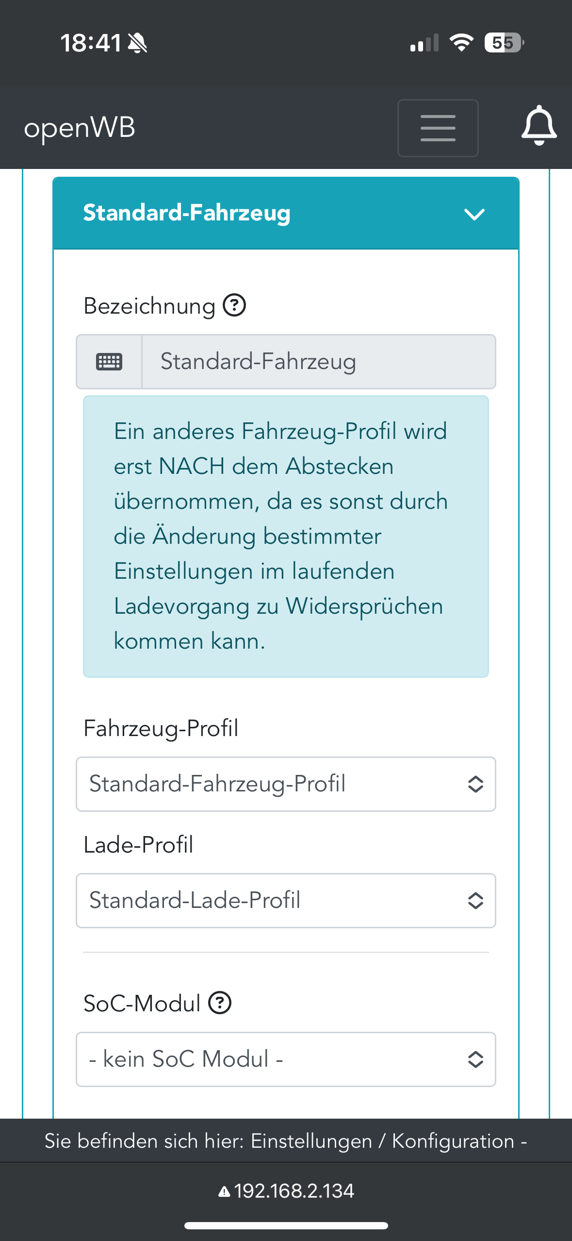 Die Idee war jetzt, dass wenn ich das Auto sofort laden möchte, dass Schnelllade Profil auswähle und wenn ich den Ladestecker abziehe und wieder anstecke, dass er standardmäßig dann wieder auf das Standard Profil wechselt.