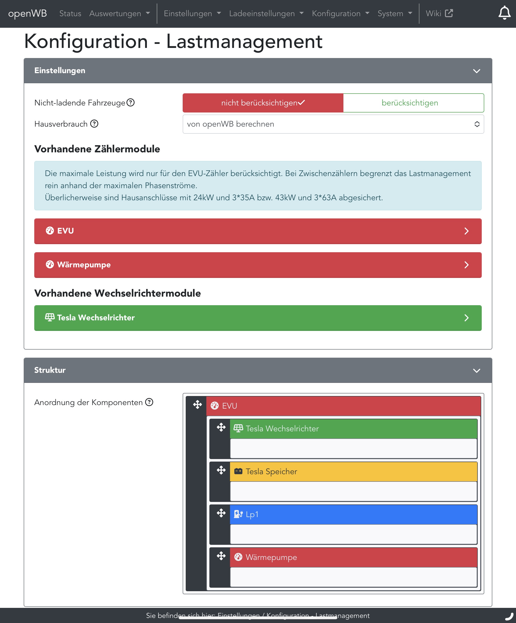 - Menü „ Einstellungen > Konfiguration > Lastmanagement > Struktur“