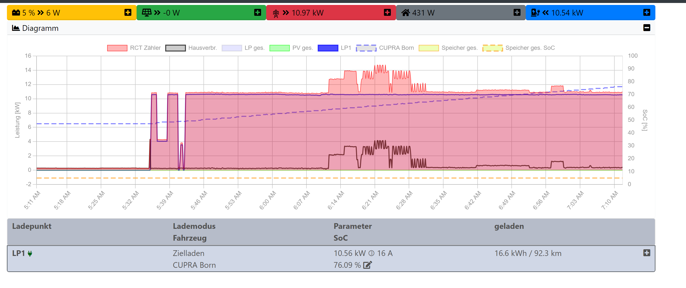 Okay, ich war der Meinung, dass der Skoda zu langsam antwortet und dadurch ab und zu der Wert nicht korrekt übernommen wird. Aber dass hier dann 5 Minuten nach dem Einstecken irgendwie ein Wert errechnet wird, der nichts mit dem aktuellen SoC des PKW zu tun hat, habe ich nicht mit diesem Problem in Verbindung gebracht. Wenn beim einstecken 5 Minuten lang 0% angezeigt wird hat er ja keinen Wert bekommen, warum lädt er dann nicht von 0% aus weiter errechnet die Werte von 0% aus bis der PKW irgendwann das beladen beendet?LenaK hat geschrieben: Mo Nov 18, 2024 10:13 amIch habe dir mehrfach erklärt, dass es in der aktuellen Version mit dem Skoda nicht funktioniert. Bitte nutze nur den manuellen SoC ohne Auslesen aus dem Fahrzeug, bis dieser PullRequest gemergt ist: https://github.com/openWB/core/pull/2000raudi hat geschrieben: Do Nov 14, 2024 7:56 pm Das gleiche hatte ich heute wieder, stecke rein, SoC bleibt auf 0, er beginnt zu laden und 5 Minuten später springt er auf 95% meint er habe den Ziel SoC erreicht und hört auf... Dabei hat er erst 60%. Okay, SoC auslesen klappt nicht oder nicht immer, aber warum errechnet er dann irgendwelche Werte aus alten Infos? ich hatte den manuellen SoC auf 0 eingestellt. Woher holt er dann 5 Minuten später diese Werte?