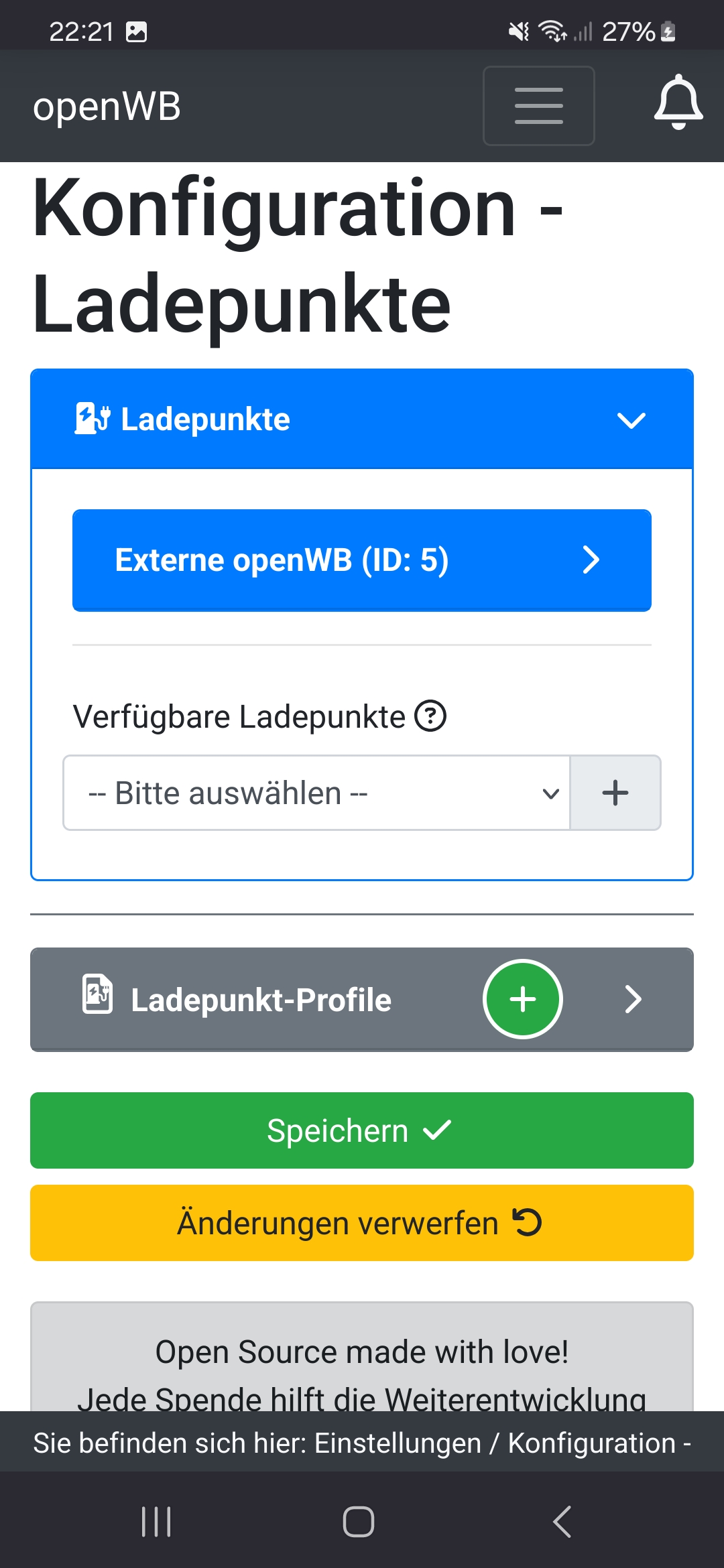Zeig' doch bitte mal einen Screenshot von der Konfiguration des Ladepunkts in der openWB (Einstellungen > Konfiguration > Ladepunkt). Die Fehlermeldung auf der Statusseite lässt vermuten dass hier etwas nicht stimmt.mann oh hat geschrieben: Di Nov 26, 2024 8:41 pm Guten abend, habe ein Problem mit meiner wallbox!