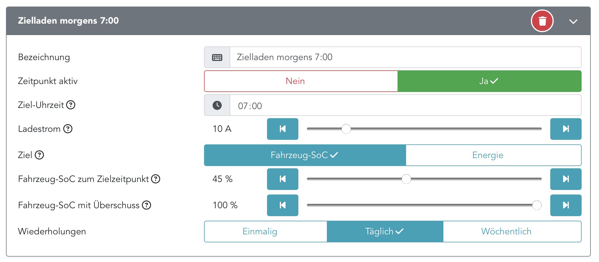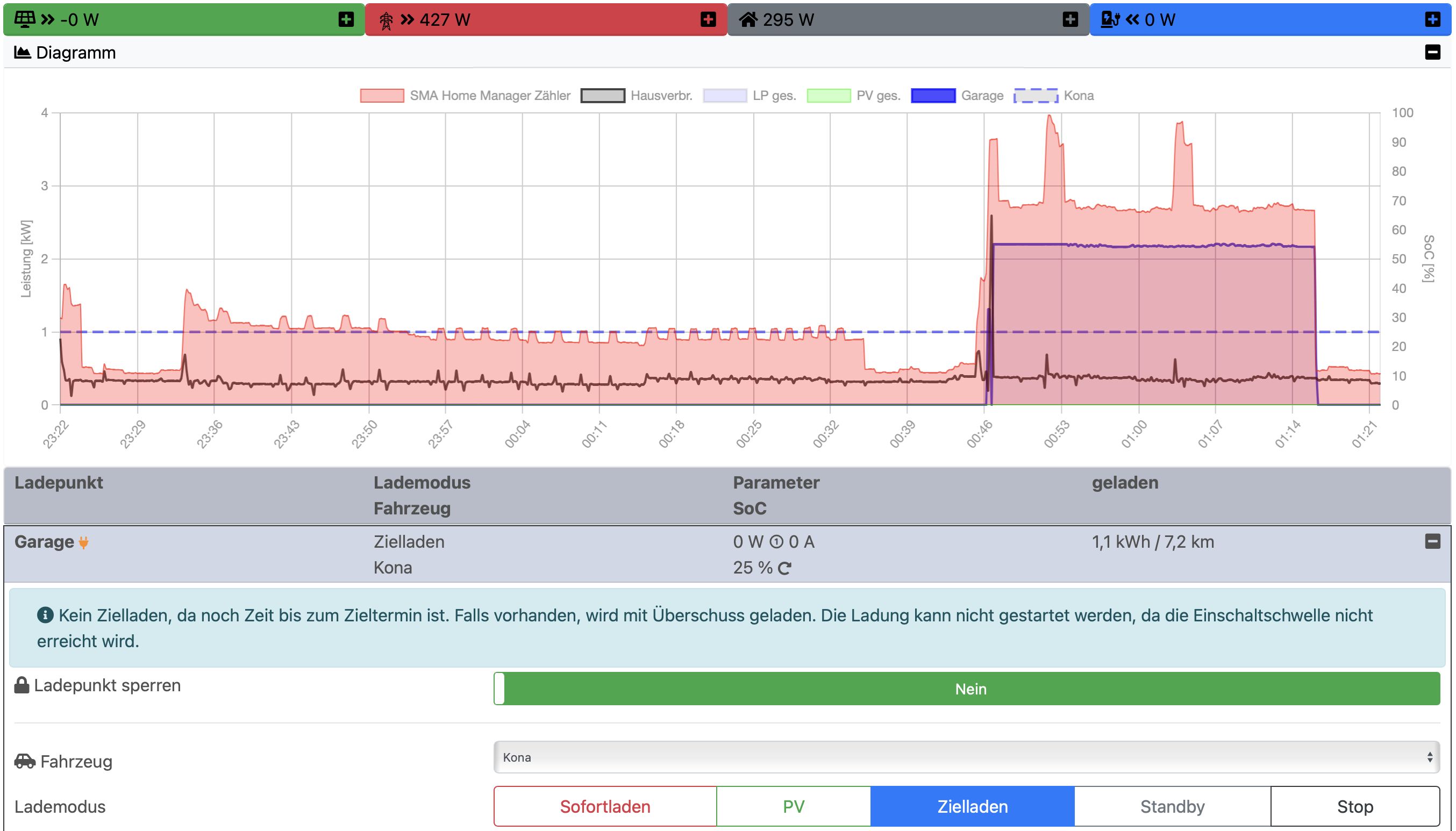 Nun ist es jetzt Winter und meine PV-Anlage bringt nun nicht mehr so viel Leistung, wenn überhaupt möglich (Schnee, Nebel usw.), das ich mein EV im PV Modus laden kann. Nun stell ich von PV-Laden auf Zielladen um, damit ich, wenn kein PV-Laden möglich ist zur nächsten eingestellten Zeit, meist am nächsten Morgen, meinen beim Zielladen eingestellten SoC (z.B. 50%) erreiche um durch den Tag zu kommen.