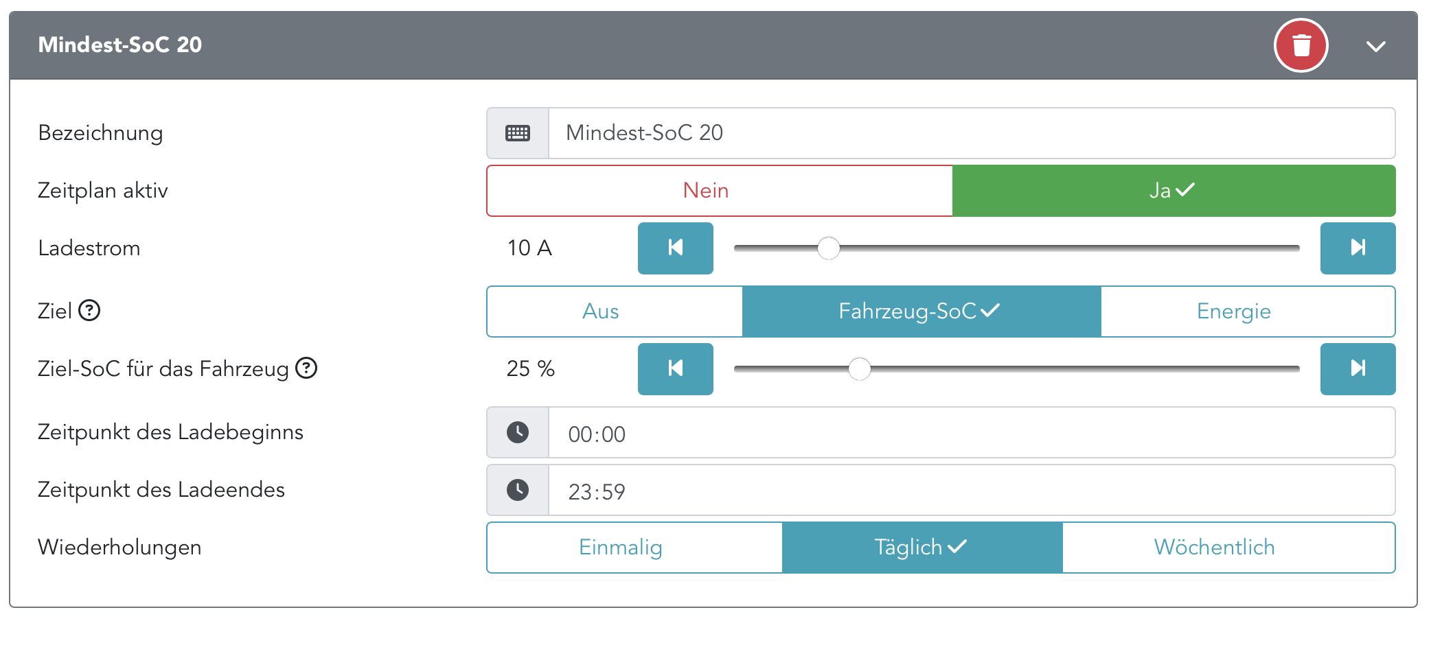Wenn Du immer mind auf 20% laden willst, passt es für dich besser einen Zeitplan von 0:00 bis 24.00 zu erstellen mit SoC-Begrenzung auf 20%?