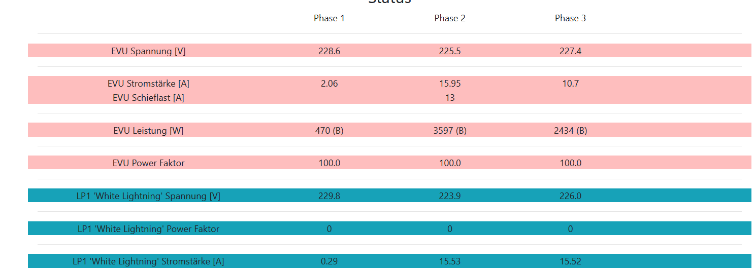 Eigenartig finde ich nur, dass im Status Log auch die Phase 1 zwar Spannung hat aber kein Strom fließt. Da ich die Phasen gedreht habe, müsste es doch dann entweder Phase 2 oder 3 sein, die keinen Strom durchlassen? Siehe Bild