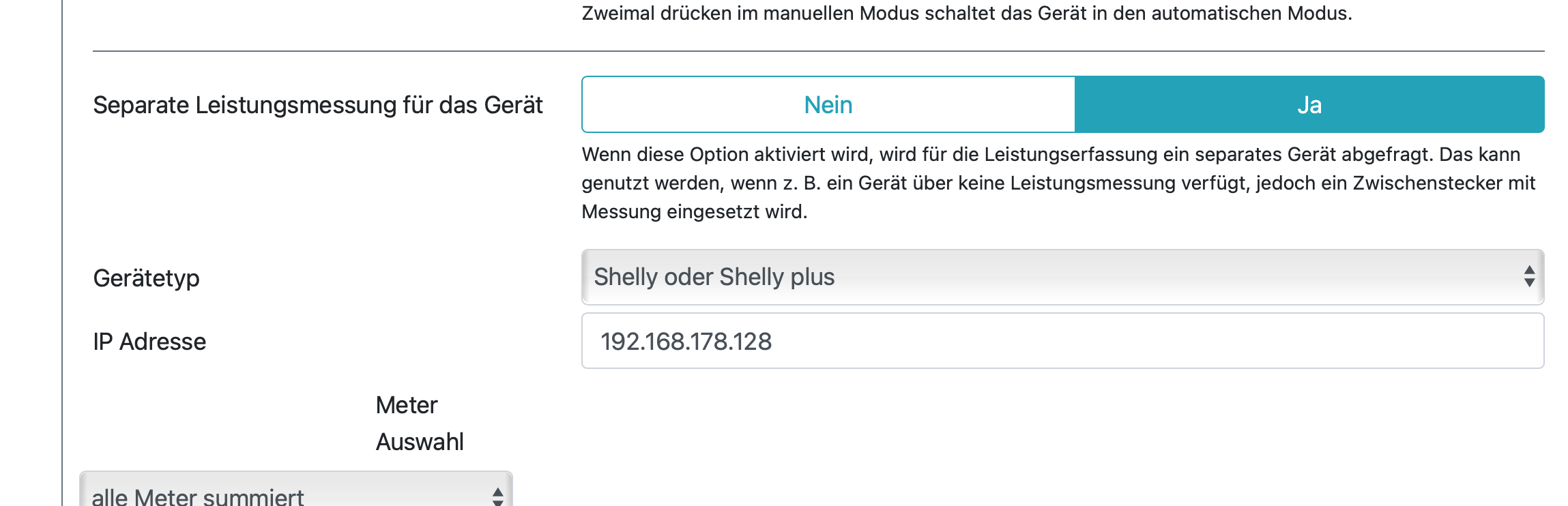 Hab schonmal probiert "Gerätetyp" = kein Gerät und "Separate Leistungsmessung für das Gerät"=Ja zu setzen, das bringt aber keine Änderung.
