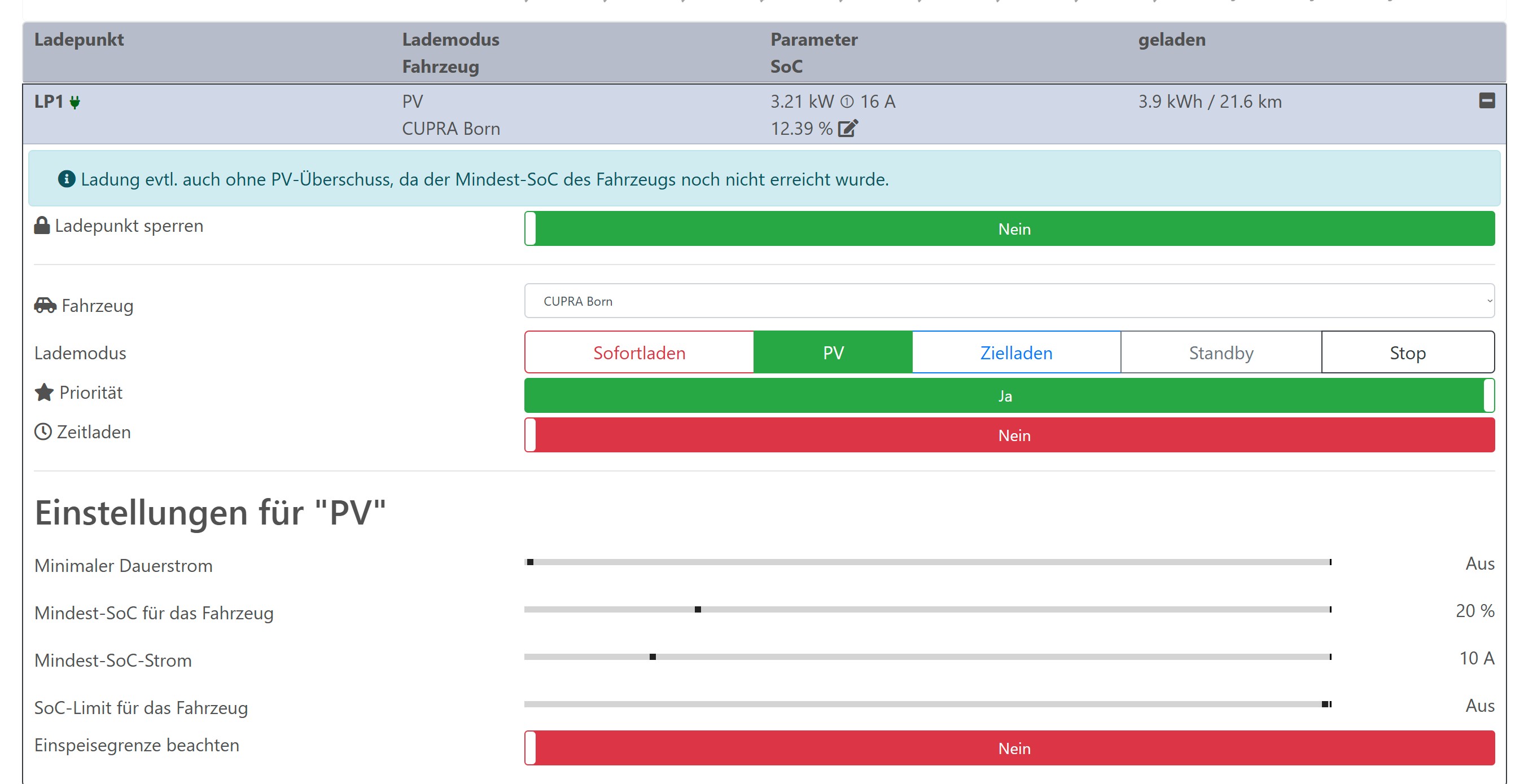 Es wird im PV Modus dreiphasig geladen obwohl der Überschuss nur für einphasig ausreichen würde. Hab' schon über mehrere Minuten Netzbezug. LP sperren & entsperren hat das Problem nicht behoben.