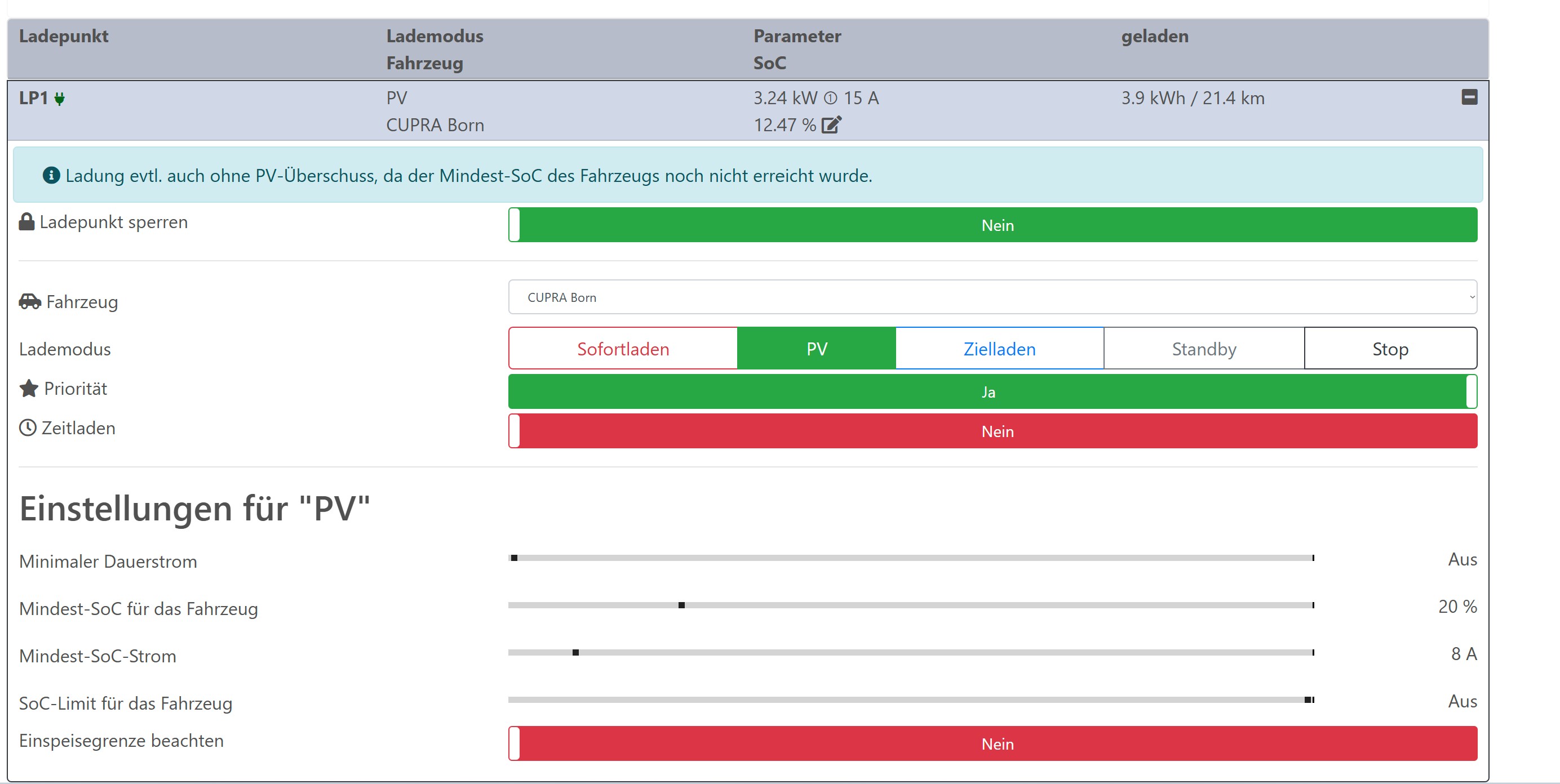 Es wird im PV Modus dreiphasig geladen obwohl der Überschuss nur für einphasig ausreichen würde. Hab' schon über mehrere Minuten Netzbezug. LP sperren & entsperren hat das Problem nicht behoben.