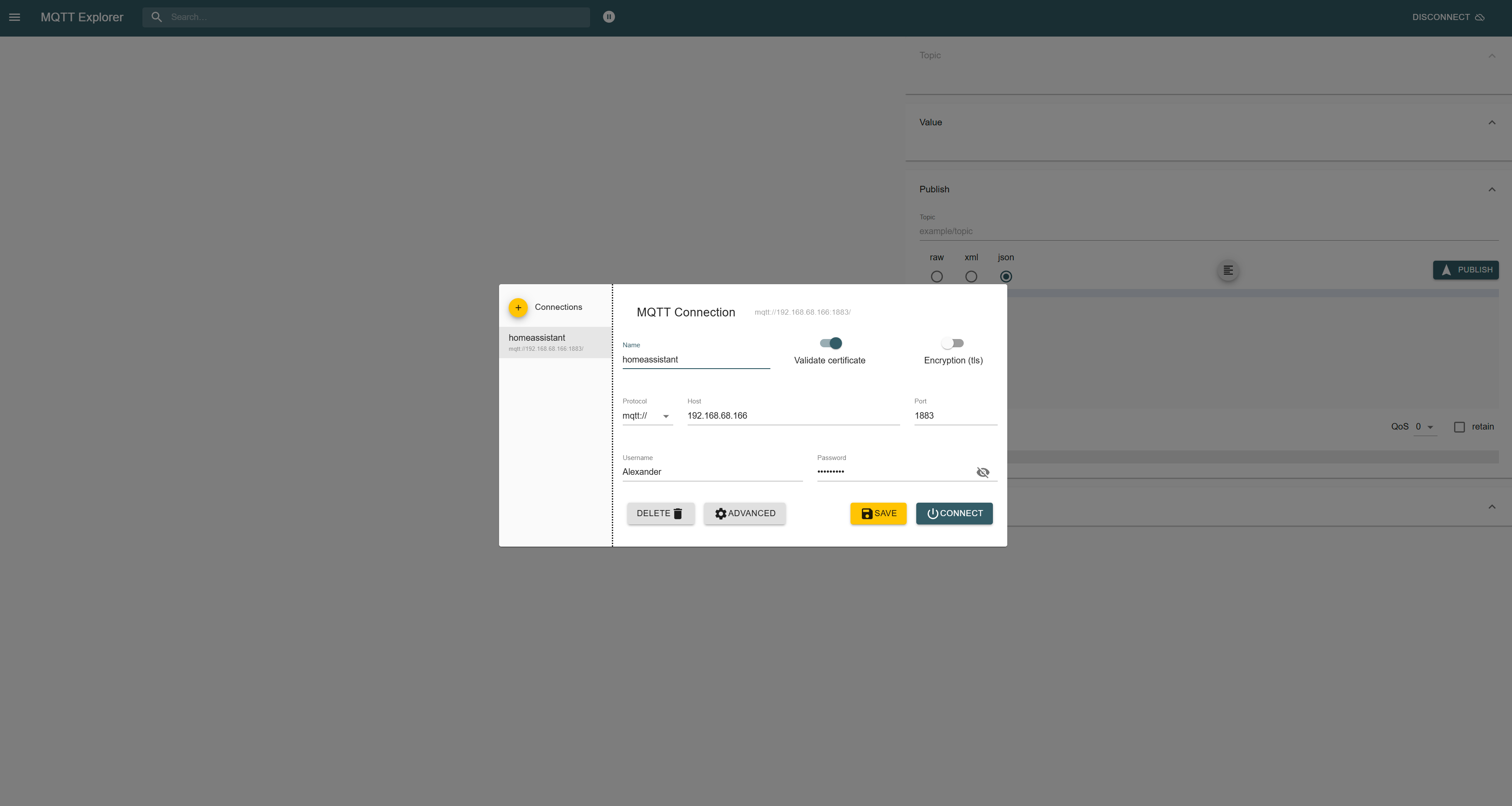 Das ist das Protokoll von Home Assistant mit MQTT, der Benutzer und das Passwort ist aber korrekt