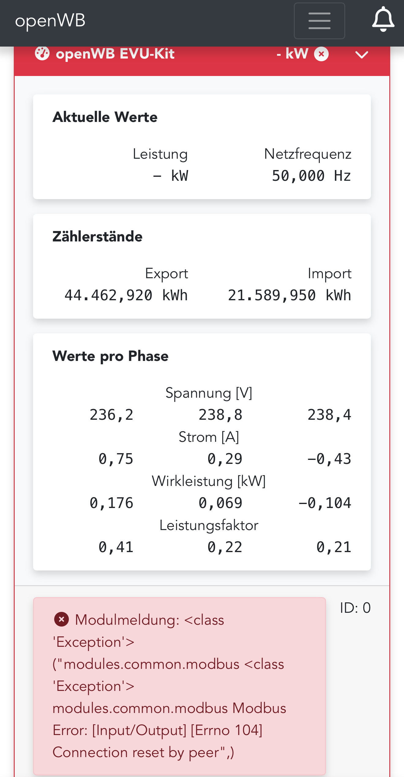 Während die Anlage normal läuft und ich über PV das Auto lade, sehe ich plötzlich, dass nur noch mit 6A heißen wird. Ein Check hat ergeben, dass das EVU-Kit nicht mehr angesprochen werden kann.