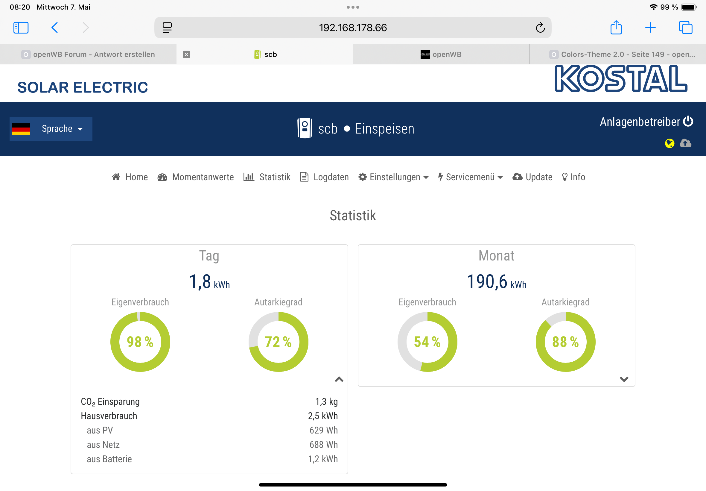 openWB-2 Standard+ | openWB EVU Kit v2 MID| 9,9kWp mit Kostal Plenticore 8.5 plus | VW ID.3, Kia EV6, Smart EQ forfour