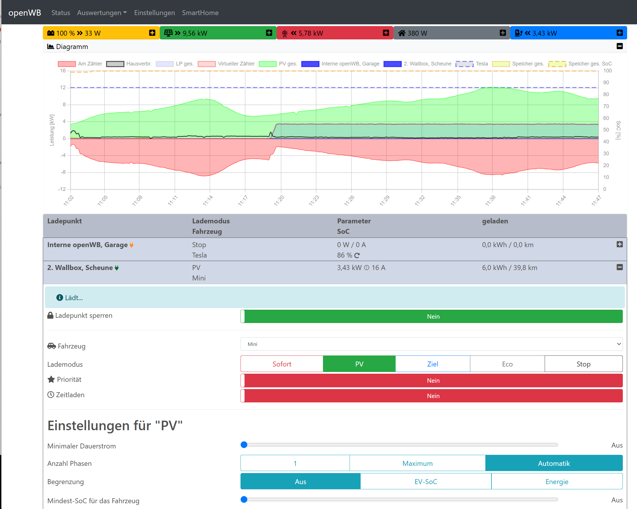 OpenWB selbstbau, Phasenumschaltung. Aktuelles Master. Hoymiles WR mit openDTU, Shelly pro 3EM als EVU, Fritz adapter und shelly pm mini als Unterzähler. Model 3, ModelY
