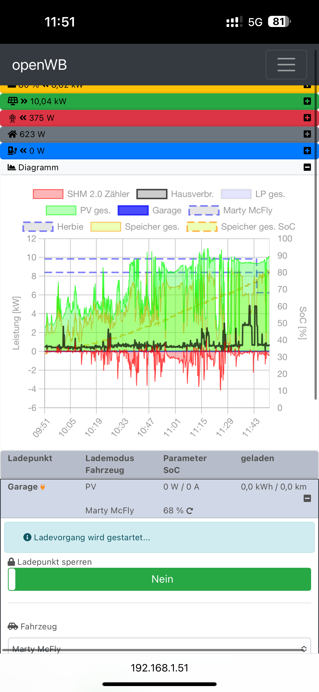 Um 08:12 war also genügend Stom da um mit 3 Phasen zu laden. Beladen wurde dann korrekt gestartet. Um 08:26 sollte auf eine Phase umgeschaltet werden, dabei hat der PKW dann einen Fehler gemeldet und hat nicht weiter geladen. Erst als ich um 08:46 den PKW abgezogen und wieder gesteckt habe, hat er weiter geladen.