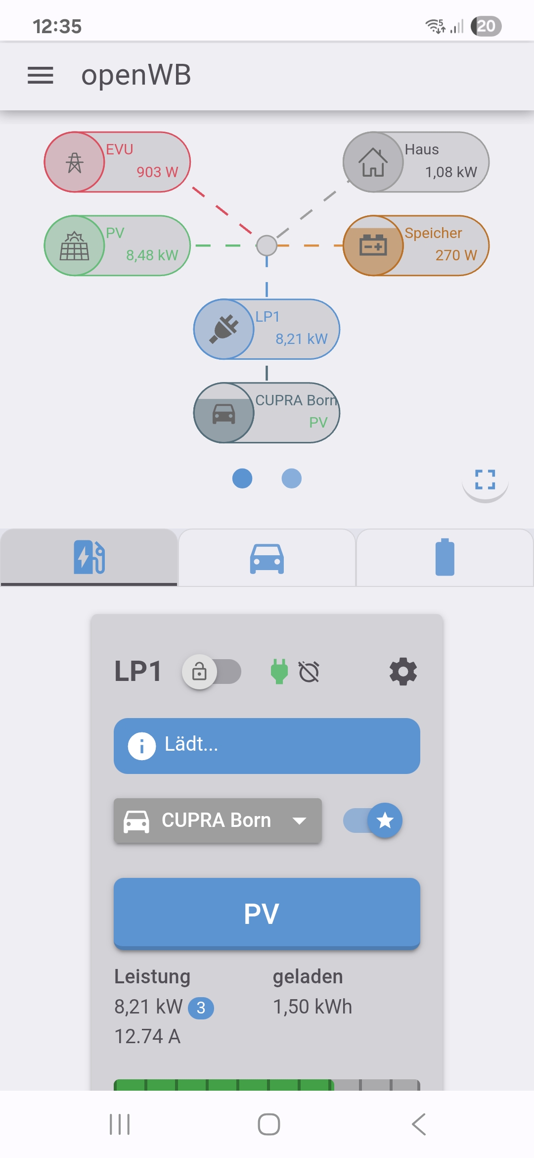 Cool wäre, wenn im folgenden Bild direkt neben dem Auto und dem Hausspeicher der SoC als Zahlenwert stehen würde.