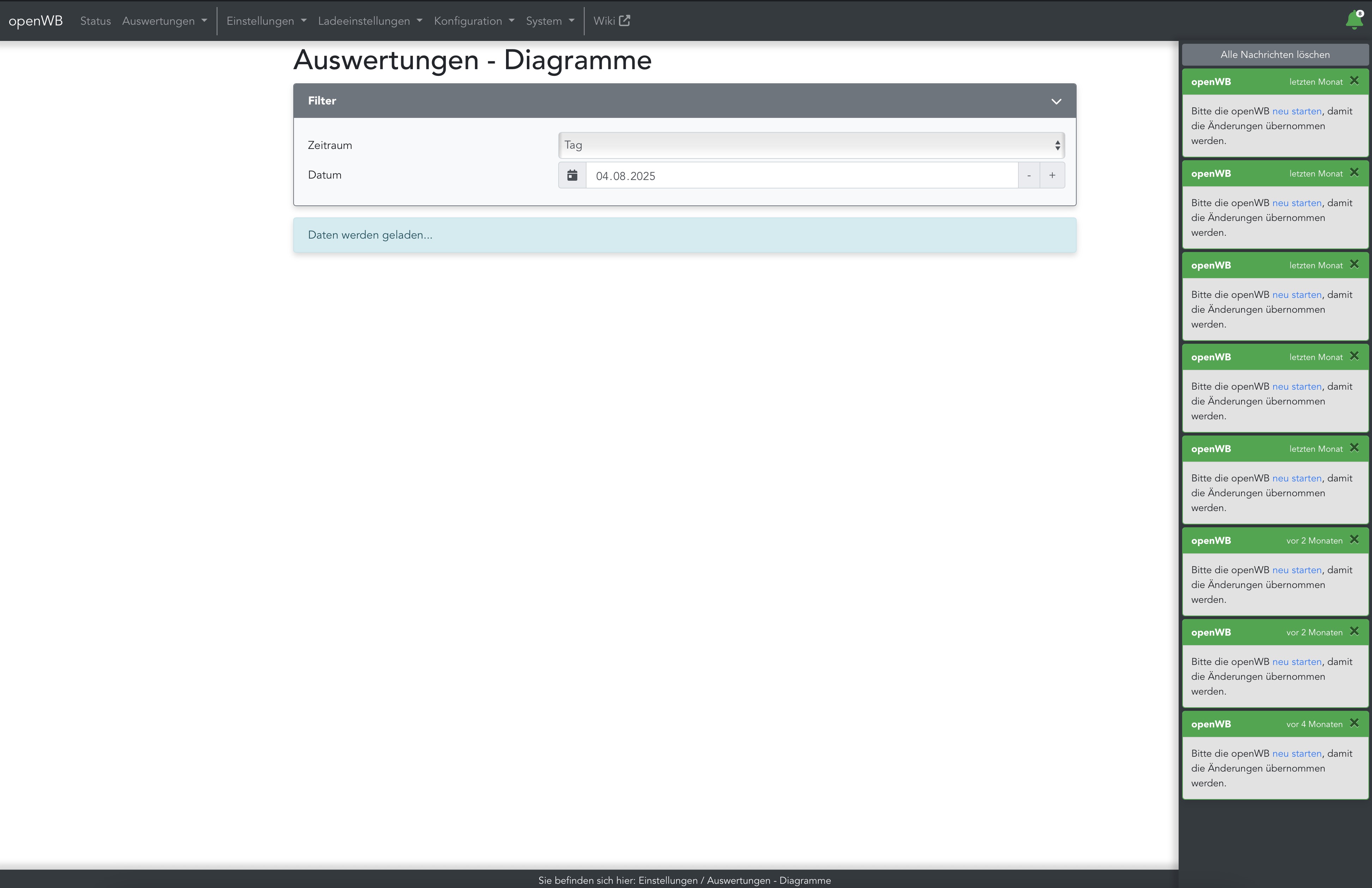 Die openWb funktioniert nach dem entdecken des Drops nicht vollständig. Also wird Sie wohl eingefroren sein wie gerade erwähnt. Ein Auto war seit gestern angesteckt, wird nun aber nicht mehr erkannt, obwohl es noch angesteckt ist. Diagramme laden nicht und unter der Glocke rechts sind ewig viele Meldungen (siehe Anhang). Externe Einflüsse wie Stromausfall etc können ausgeschlossen werden.