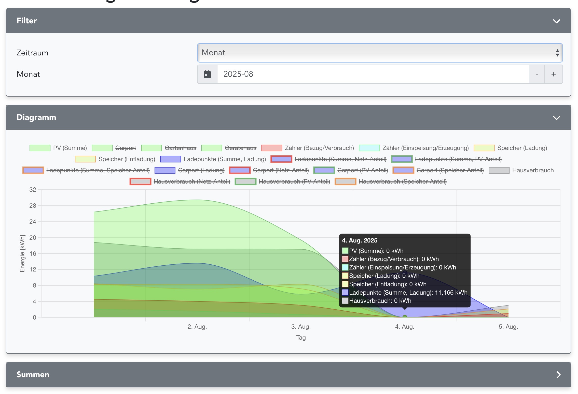 • In der Monatsübersicht steht dann z. B. beim PV-Ertrag plötzlich eine 0, obwohl der Tag definitiv Ertrag hatte.