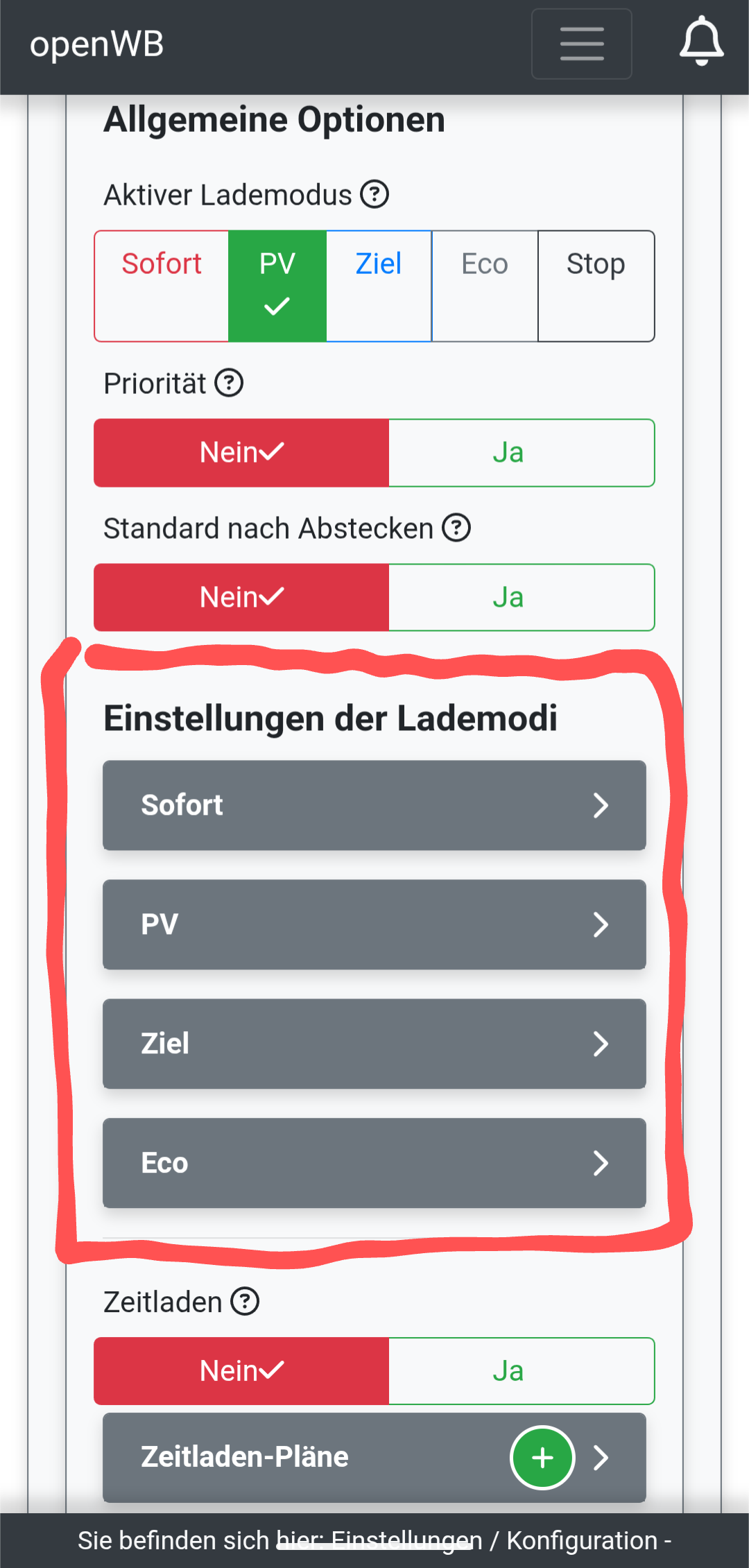 Habe neben dem Standardprofil zwei weitere Fahrzeuge. Beim Standardfahrzeug lassen sich alle Modi aufklappen. Bei meinem ersten Fahrzeug geht Sofort und Ziel, PV und Eco nicht. Beim zweiten Fahrzeug funktioniert nur Sofort, die drei weiteren Modi lassen sich nicht aufklappen.