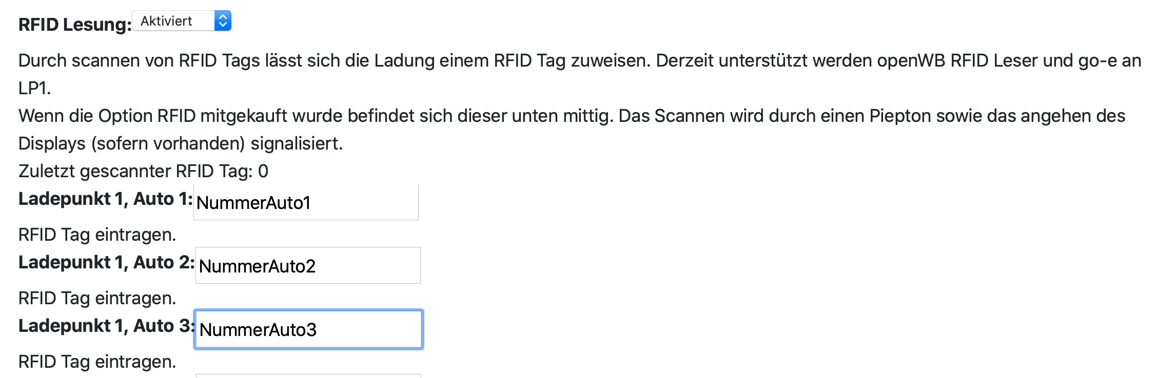 Ich bin nun stolzer Besitzer einer openWB und es funktioniert toll mit PV etc. Aber was ich echt nicht durchschaue ist das RFID Modul... Was muss man da eintragen? Ich habe 5 Schlüsselanhänger und alles was ich eigentlich will ist diese den Fahrzeugen zusortieren um Ende des Monats das Ladelog ordentlich zugewiesen zu haben. Damit das Finanzamt auch zufrieden ist.