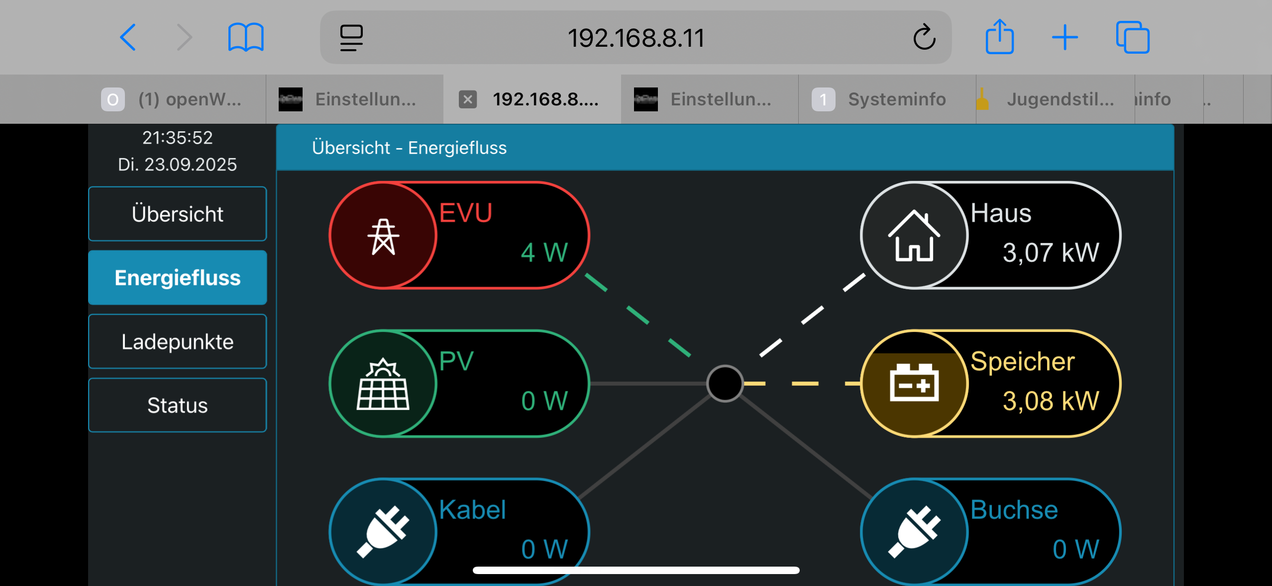 openWB-pro+, openWB-Buchse, E3/DC S10pro+19.5kWh, 30kWp Ost-Süd, Model 3 und Ion