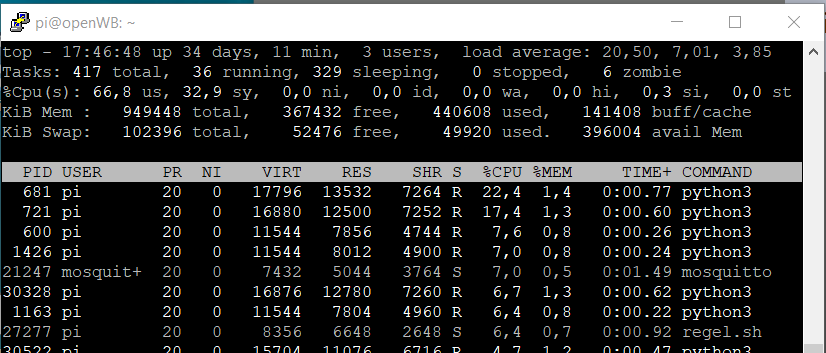 war gerade mal wieder soweit siehe Screenshot. Nach dem Neustart des Mosquitto Demons hat python viel zu tun :D